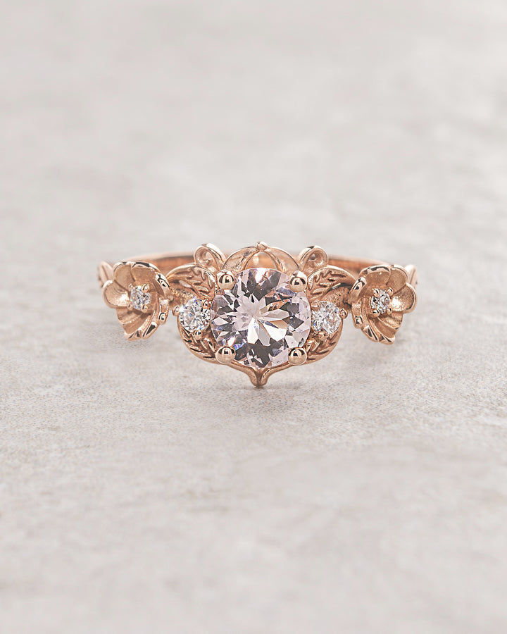 Adelina ring shows sophisticated style with central round cut gemstone, two flowers adorned with lab or natural diamonds and delicate leaves. This unique engagement ring features author's design inspired by nature. Ring shown on pictures is adorned with natural pink morganite and genuine diamonds.