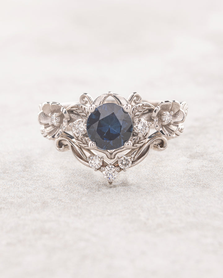 Deep blue sapphire bridal set, floral ring with diamonds / Adelina