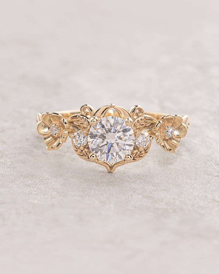 READY TO SHIP: Adelina floral engagement ring with round lab grown diamond, 14K yellow gold, RING SIZES: 5.5 - 8.5 US - Eden Garden Jewelry™