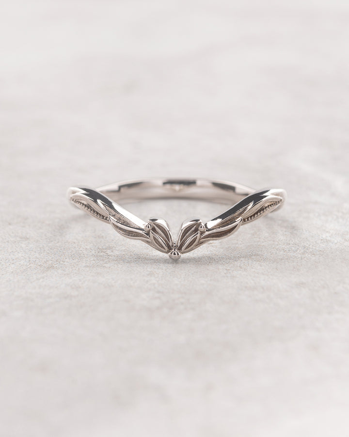 This no gem wedding band was designed especially to match with our Adonis engagement ring, but can be used separately as well. It features nature inspired style with small leaves, tiny details and curved shank. Goes perfectly as a stacking ring, but you can wear it as a single ring as well.