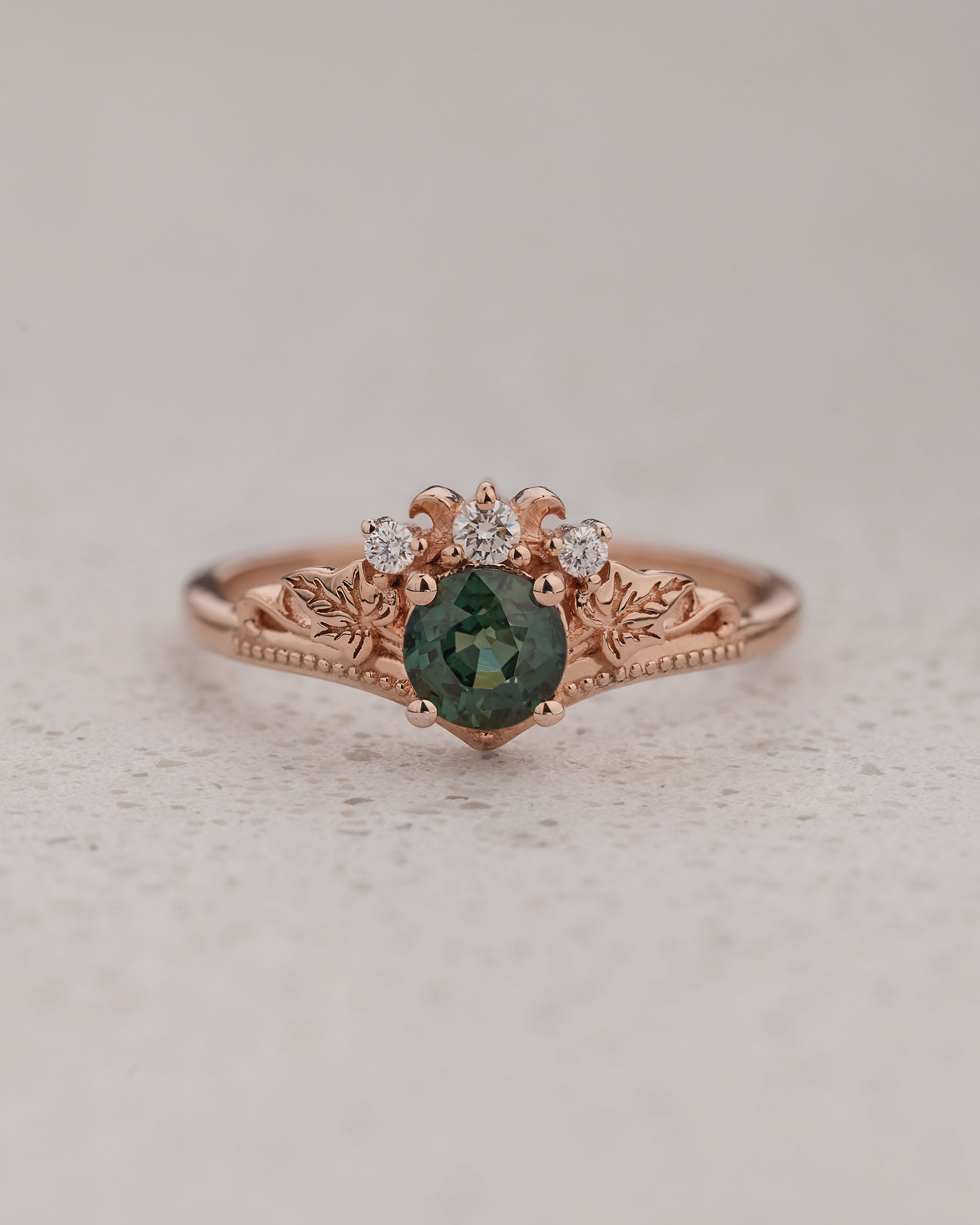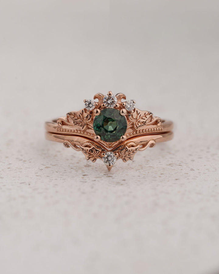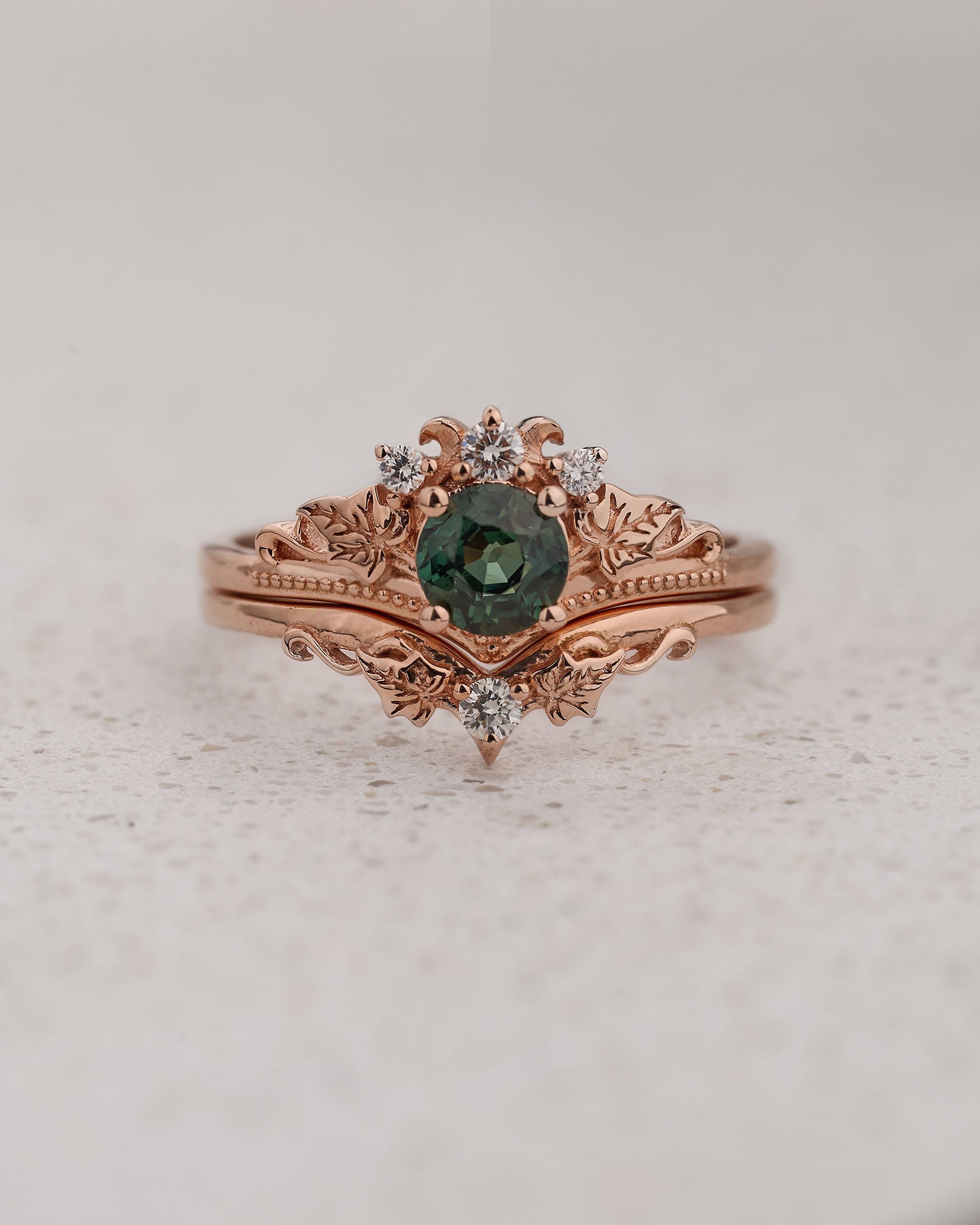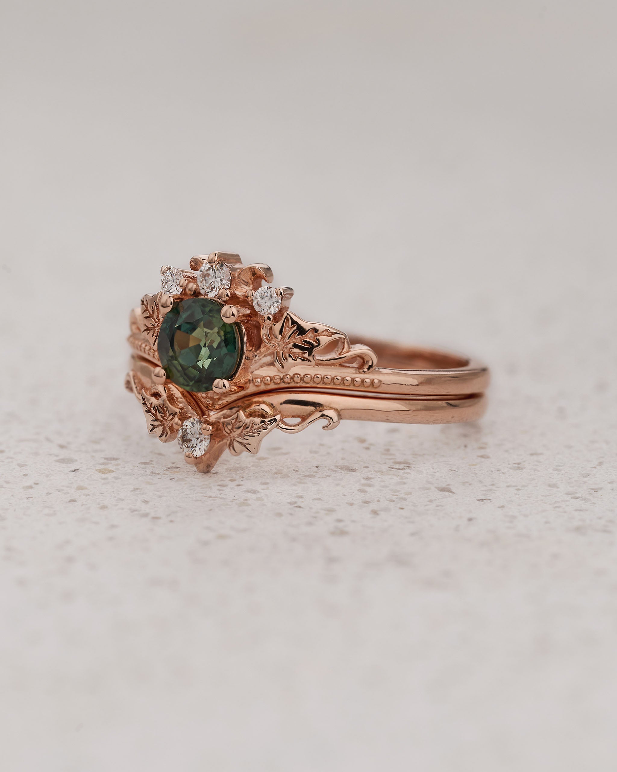 Magnificent wedding ring set features nature-inspired style with tiny ivy leaves and the most delicate details you can imagine. Round cut natural sapphire has a great teal colour. Small accent diamonds complement this romantic jewelry piece.