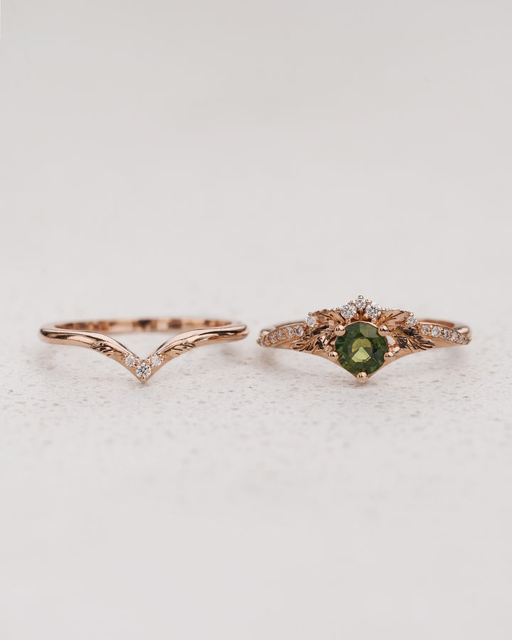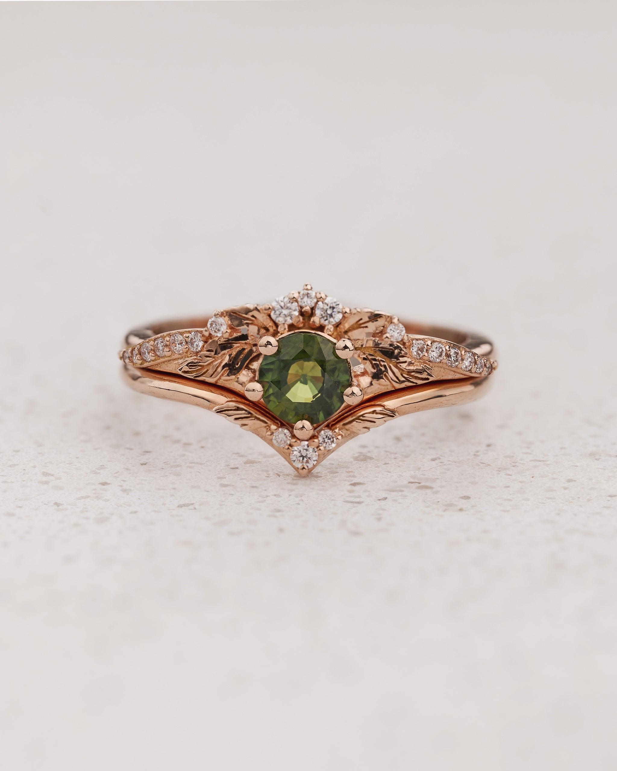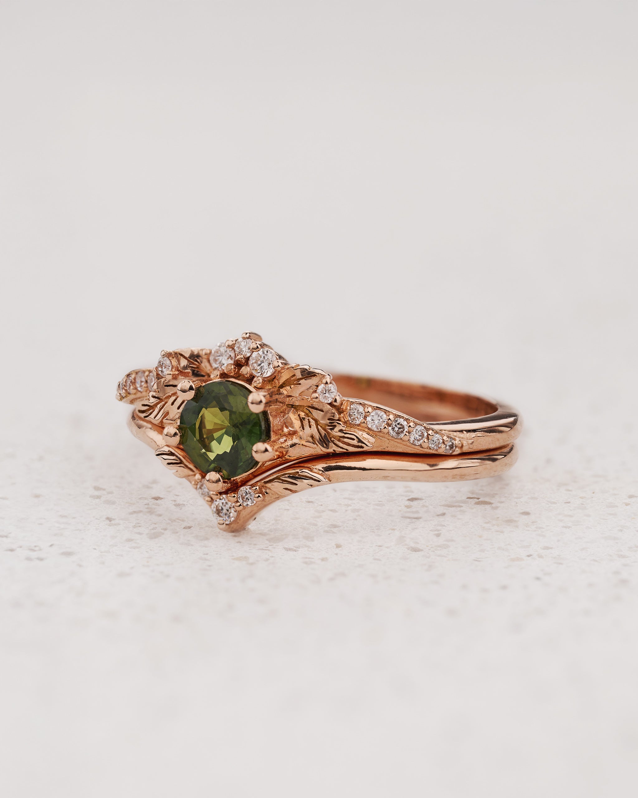 READY TO SHIP: Amelia bridal ring set with natural green sapphire, 14K rose gold, RING SIZES: 5.5 - 8.5 US