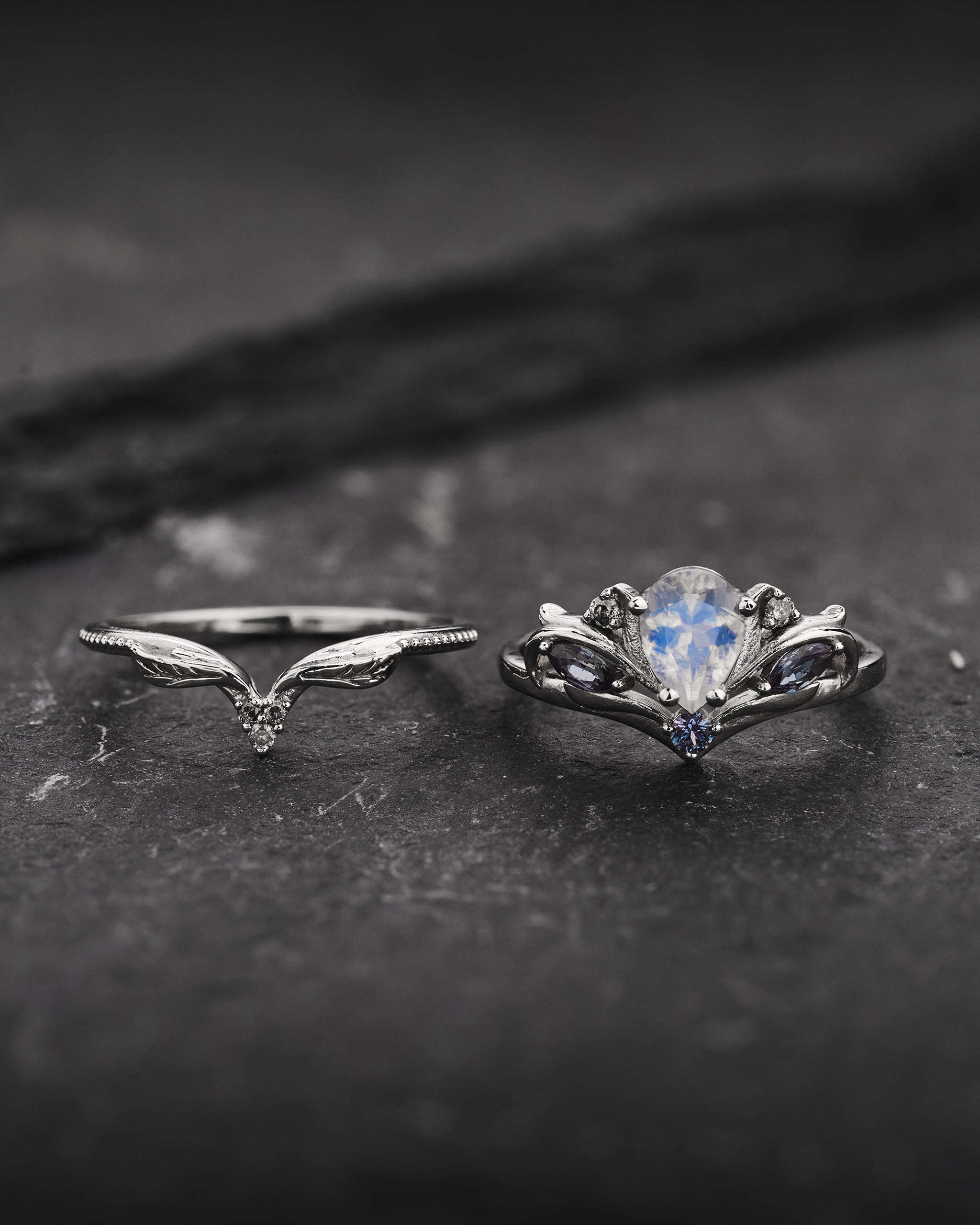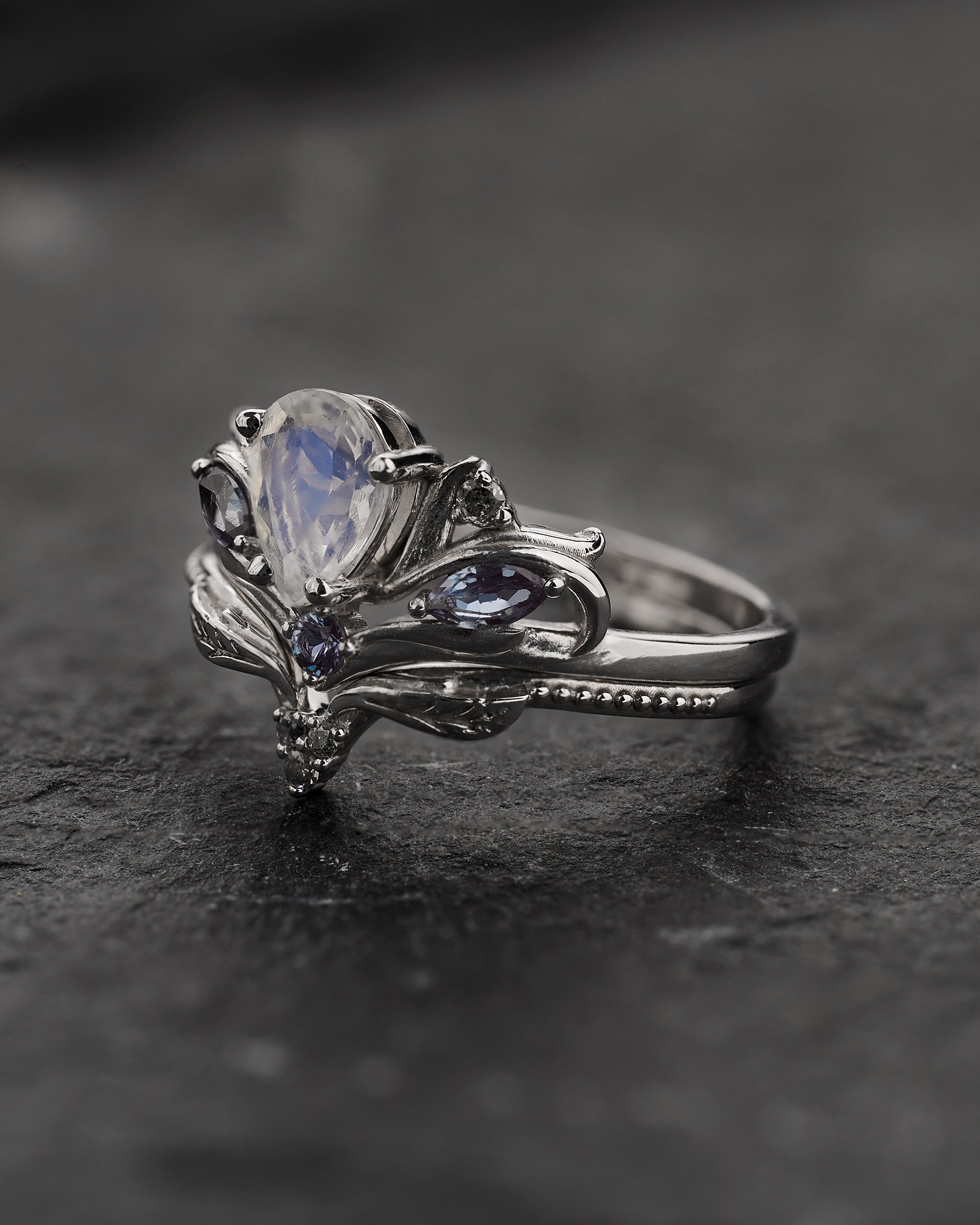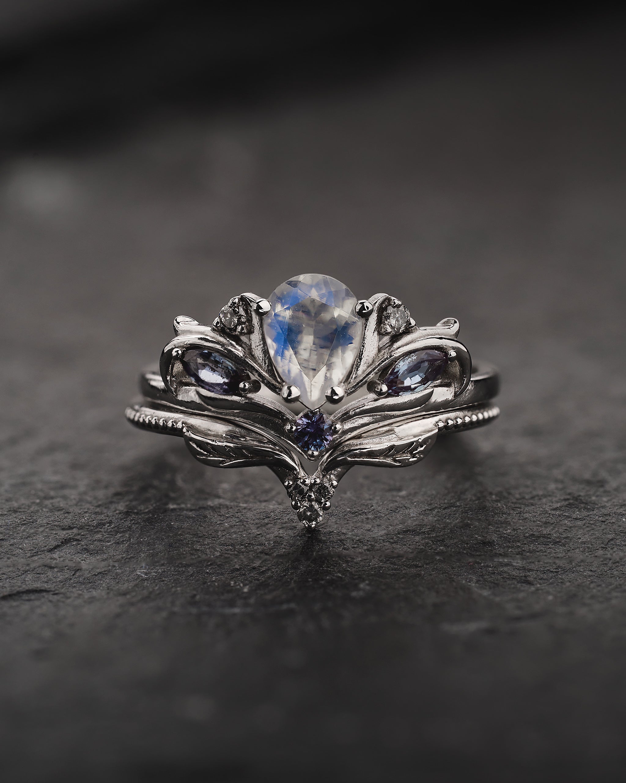 This listing is for the bridal set of two rings: engagement ring with pear-cut moonstone and a matching wedding band.