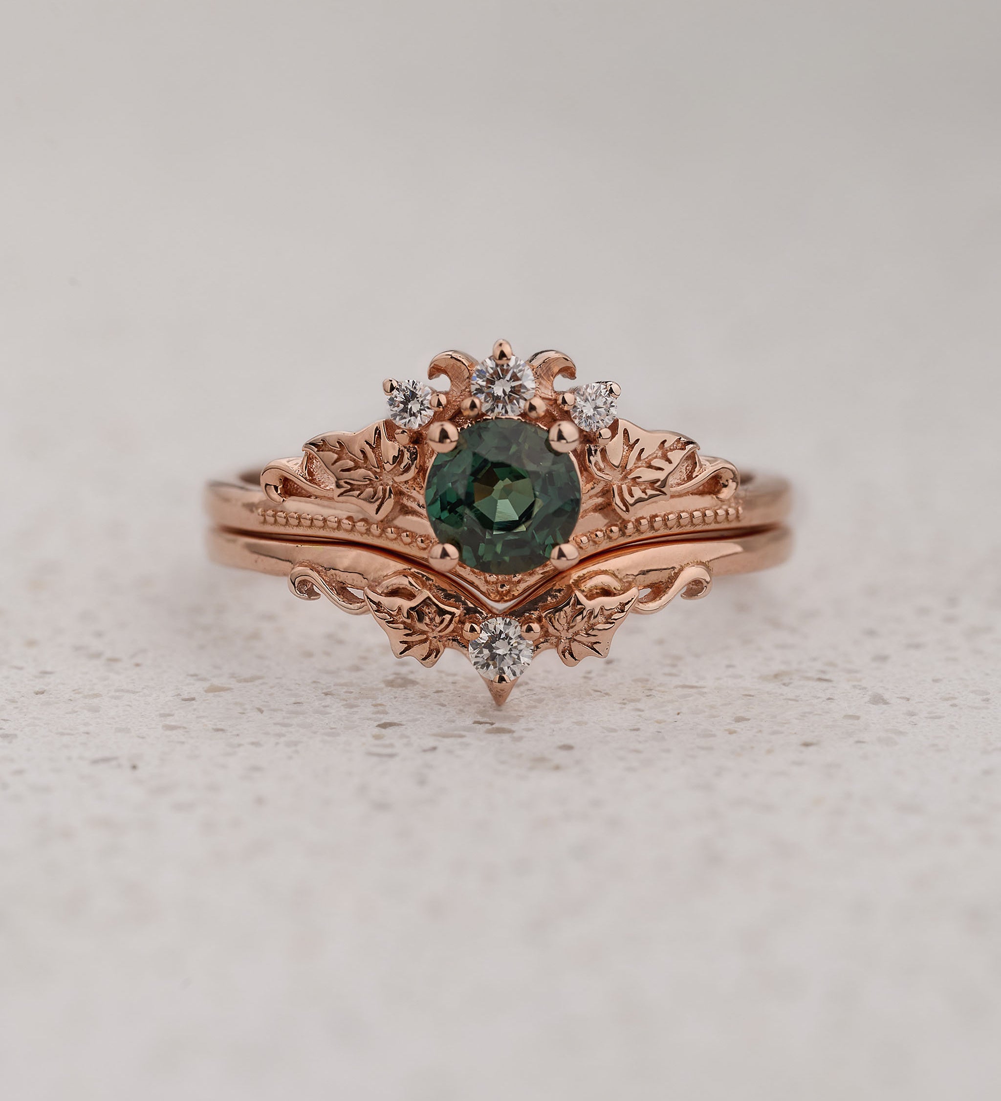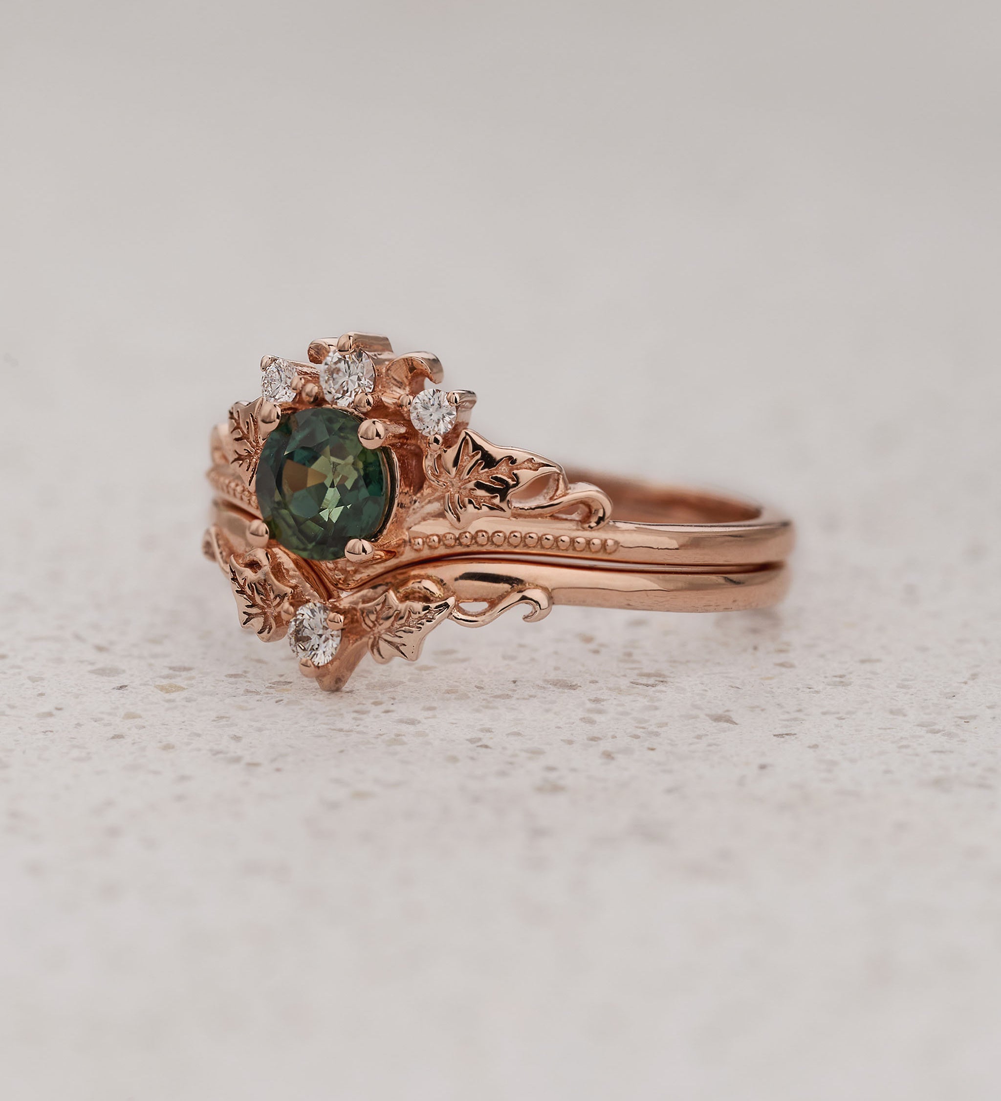 READY TO SHIP: Japanese Maple ring with natural teal sapphire , 14K rose gold, AVAILABLE RING SIZES: 5.5 - 8.5 US
