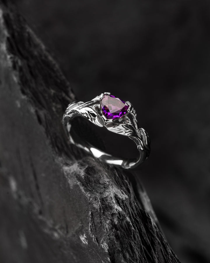 Looking for something more dramatical, modern but still nature inspired? The Clematis engagement ring was designed by my original sketches and could be perfect for alternative engagement ring seekers. Handcrafted from solid gold this branch ring featuring natural amethyst, but can be made with other stones as well.