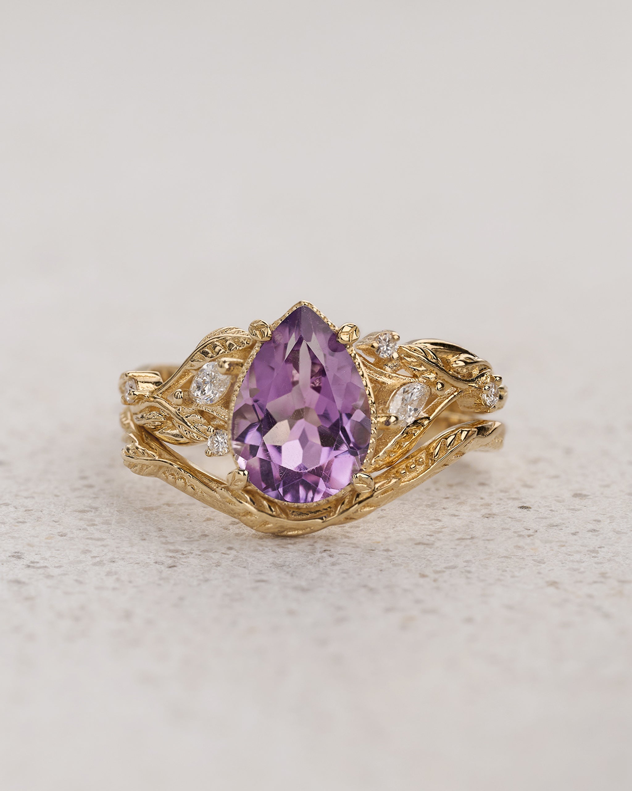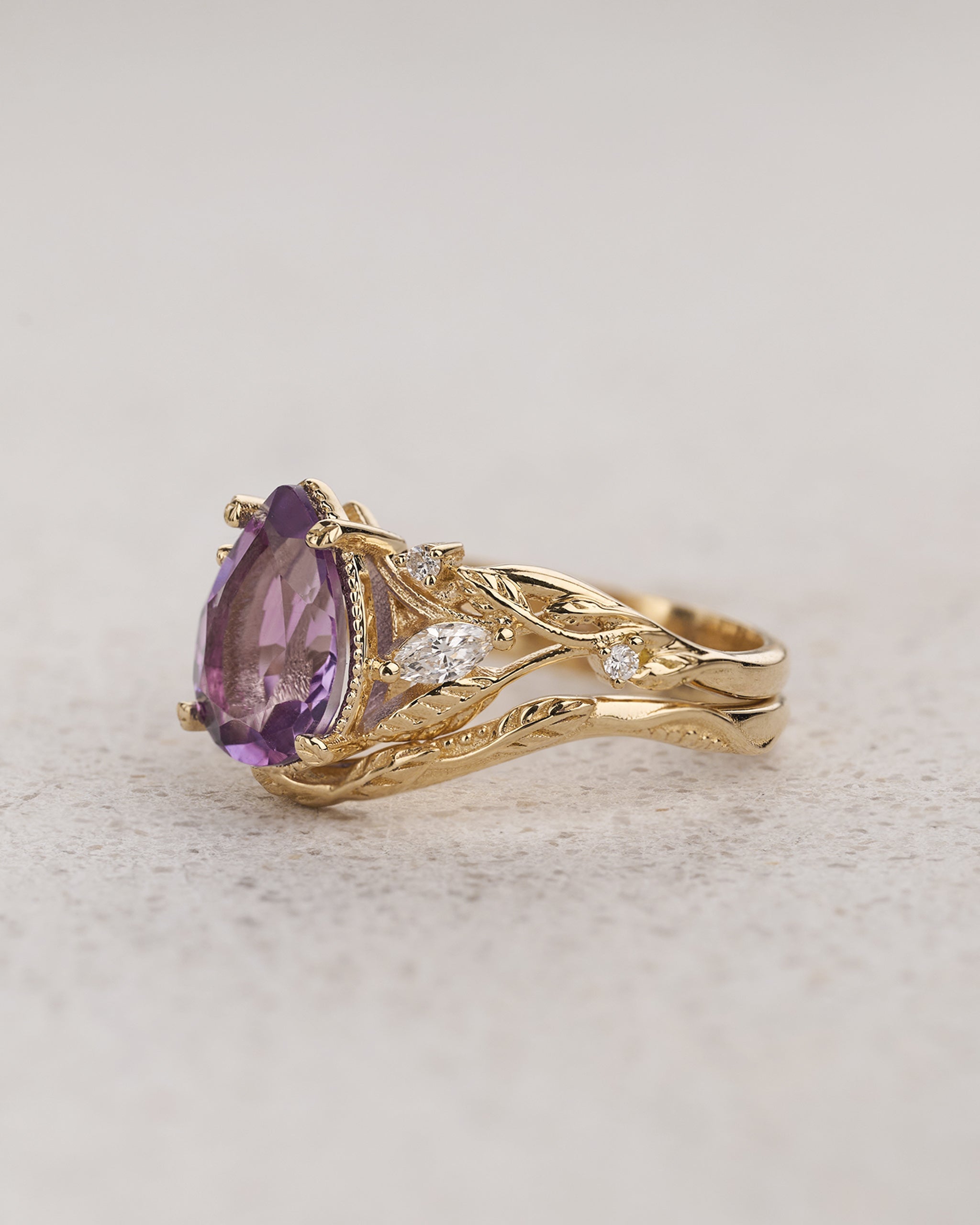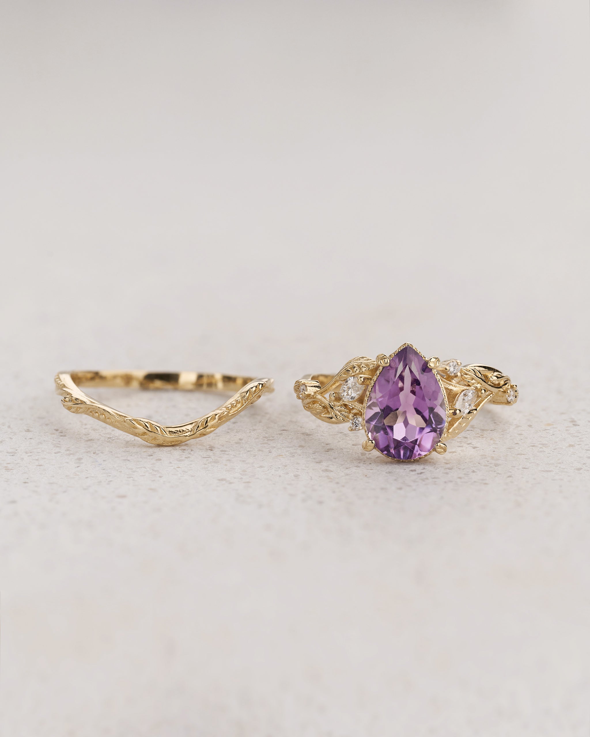 Amethyst leaf engagement ring set, big purple gemstone bridal ring set / Patricia