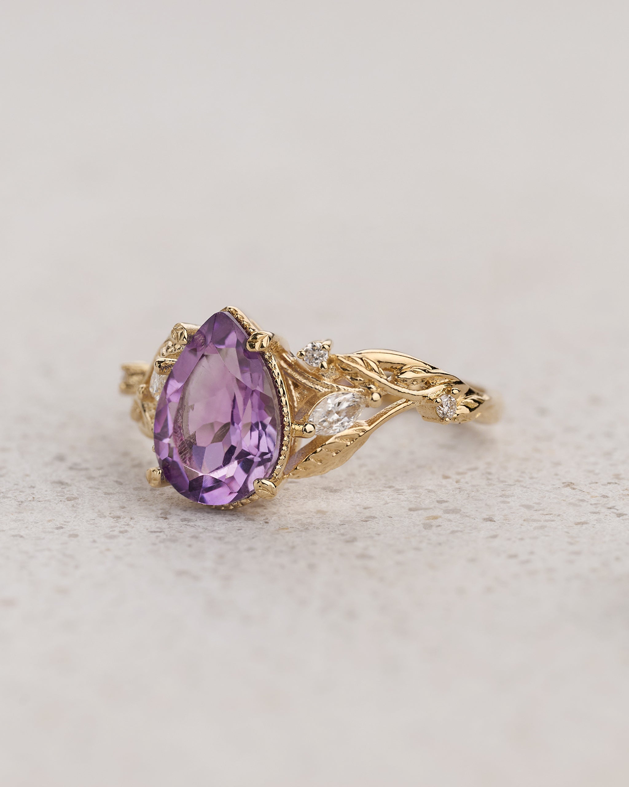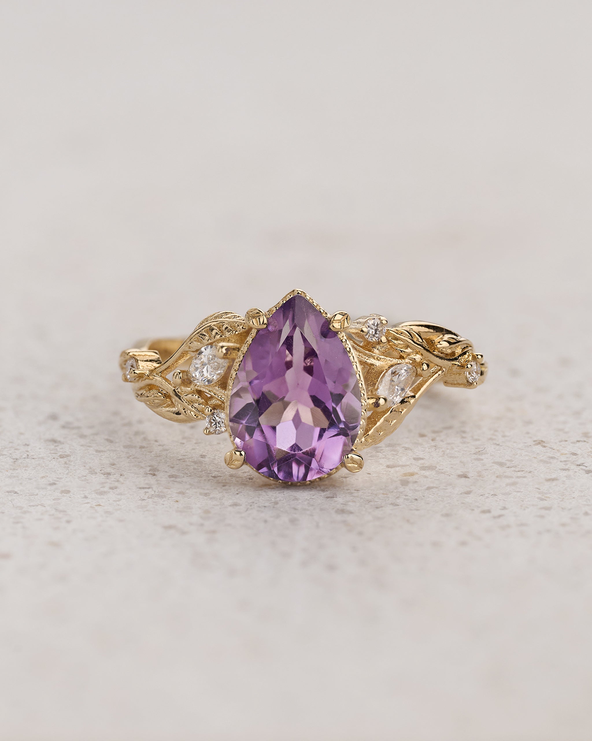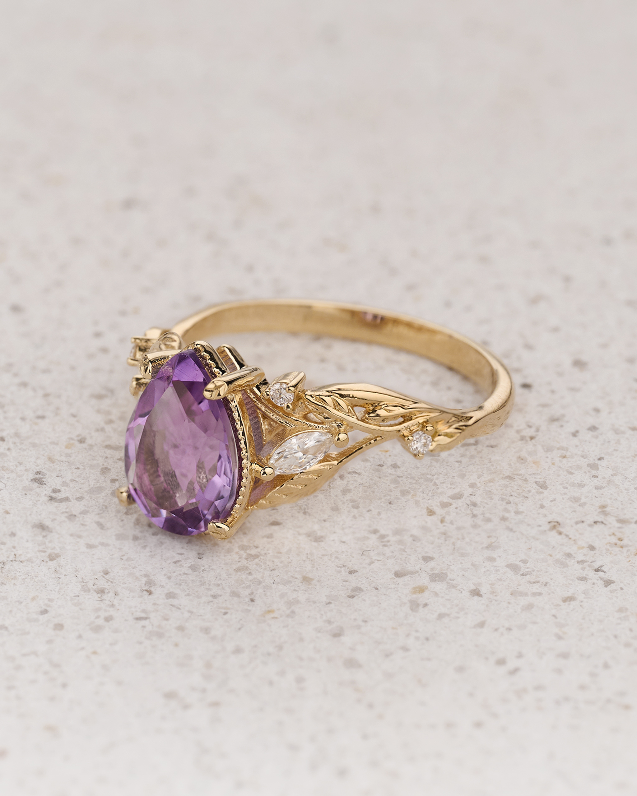 Lavender amethyst nature themed engagement ring, big pear cut gemstone gold ring with diamonds / Patricia