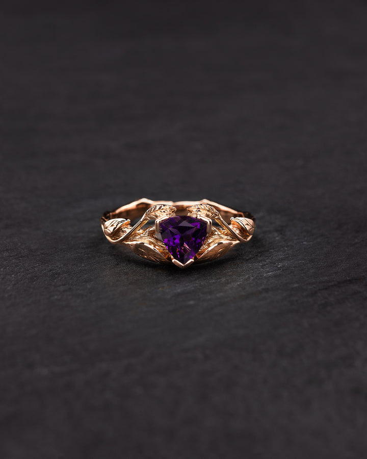 Handcrafted from solid gold this leaves band would be perfect for alternative engagement ring seekers. Trillion cut gemstone ring shows nature inspired jewelry piece with a modern twist. The Clematis engagement ring features here natural amethyst, but can be made with other gemstones as well.