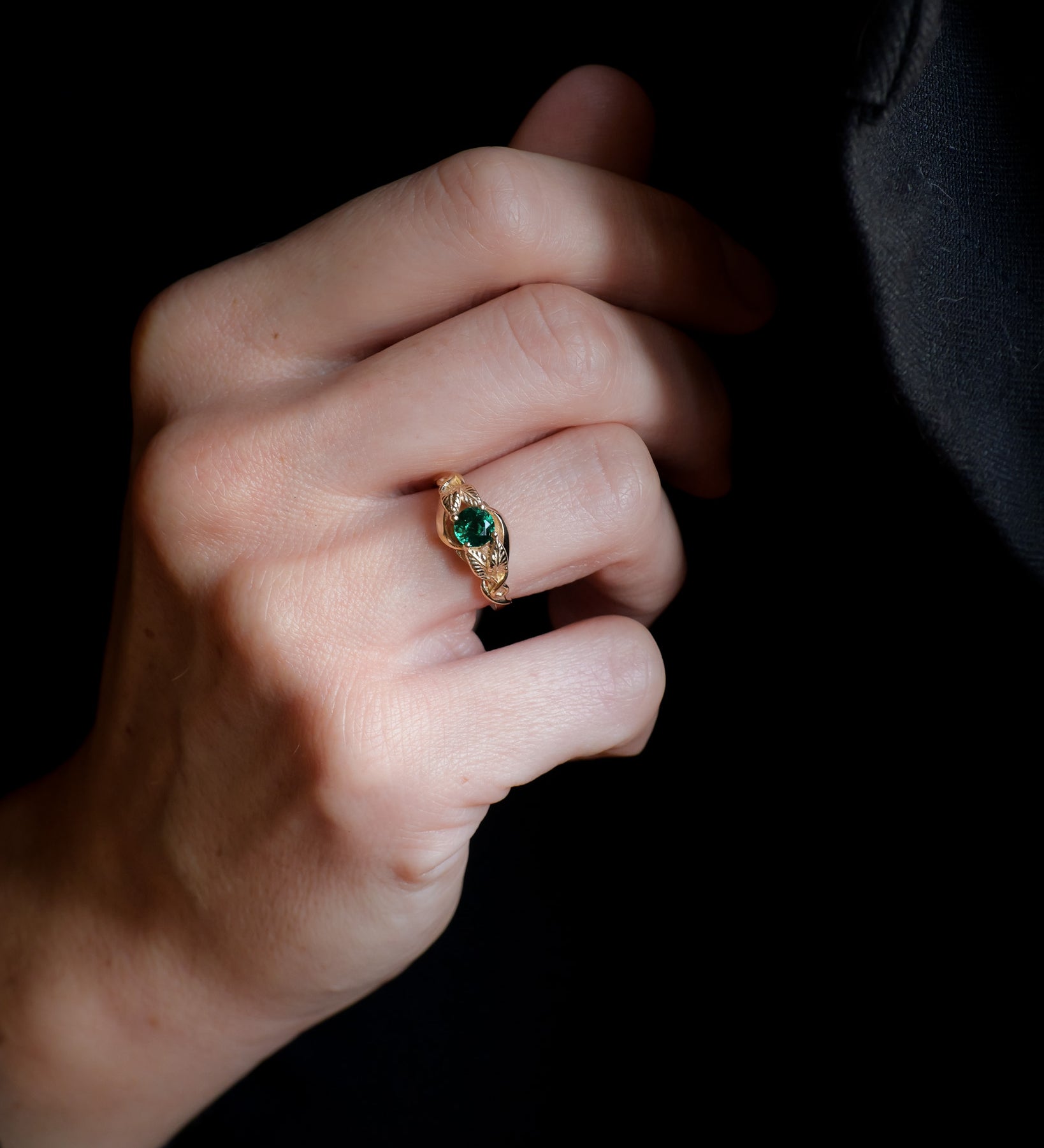 Our most delicate engagement ring, Azalea is crafted with subtle leaves that embrace a round or pear cut gemstone. This setting is available in rose, yellow, white, 14K and 18K gold with your choice of gemstone.