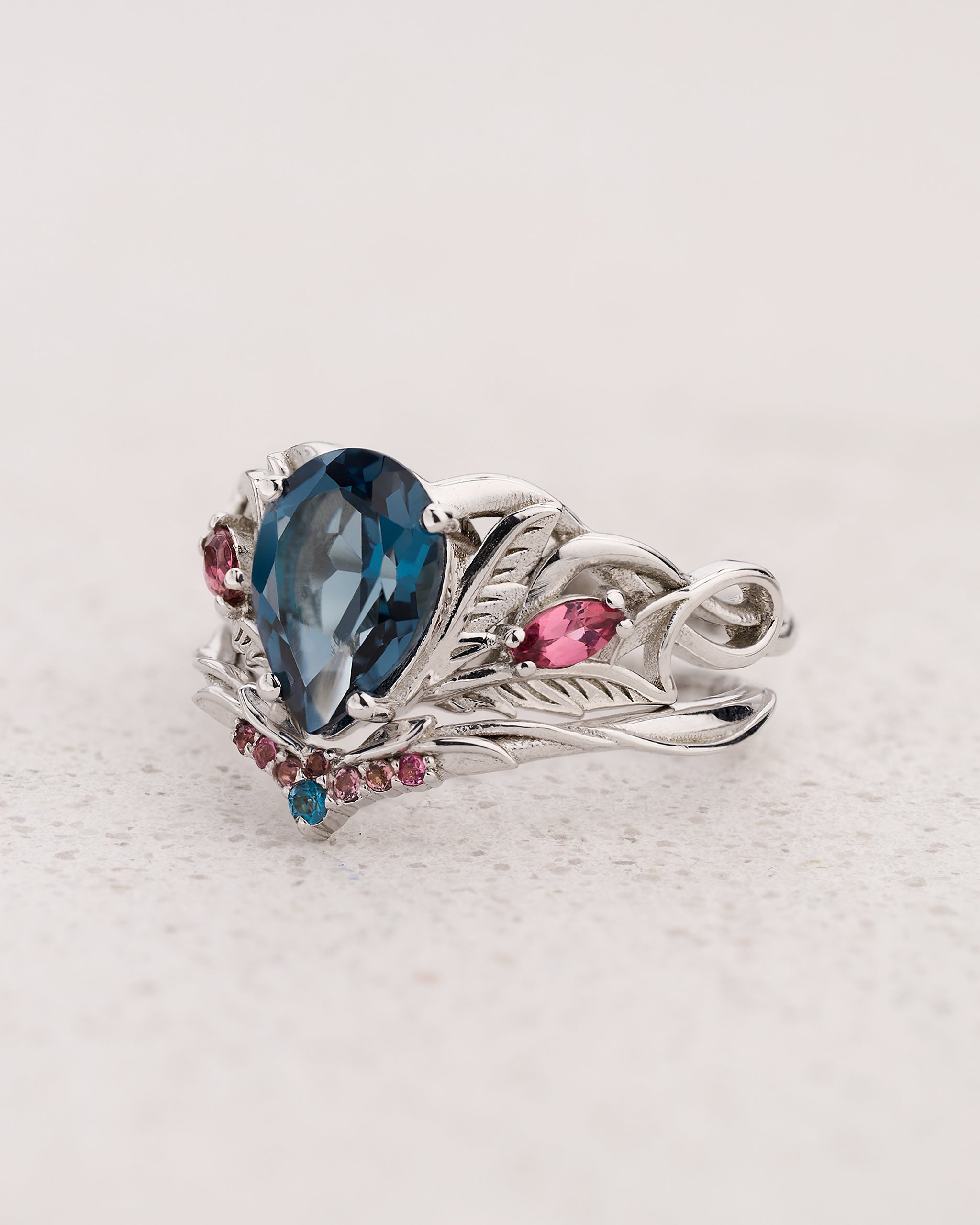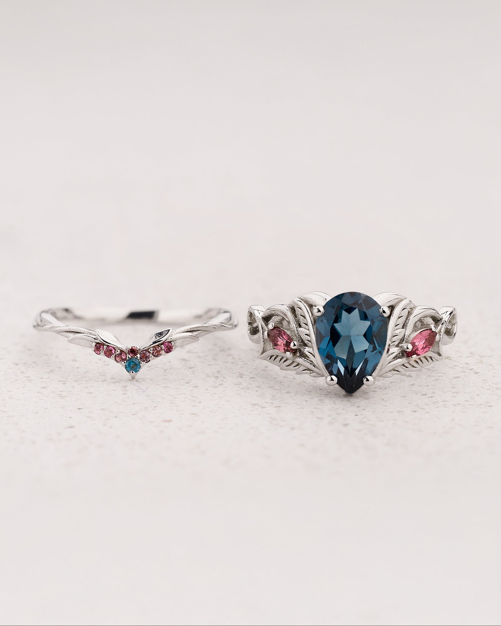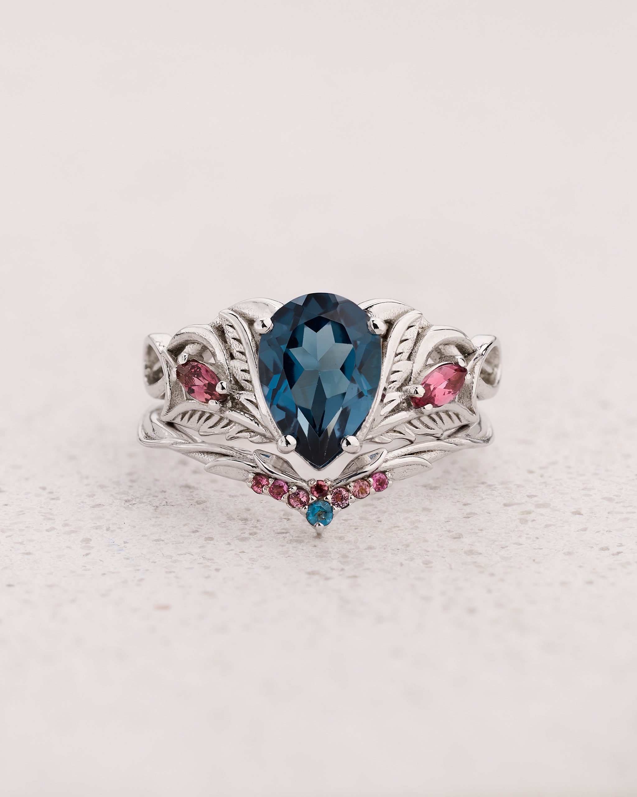 READY TO SHIP: Ikar bridal ring set with London Blue Topaz and Accent Pink Tourmalines, Aquamarines & Topazes, 14K white gold, AVAILABLE RING SIZES: 5.5 - 8.5 US