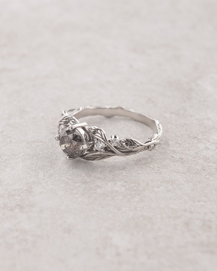 Alternative engagement ring: gold branch band with salt & pepper diamond / Clematis