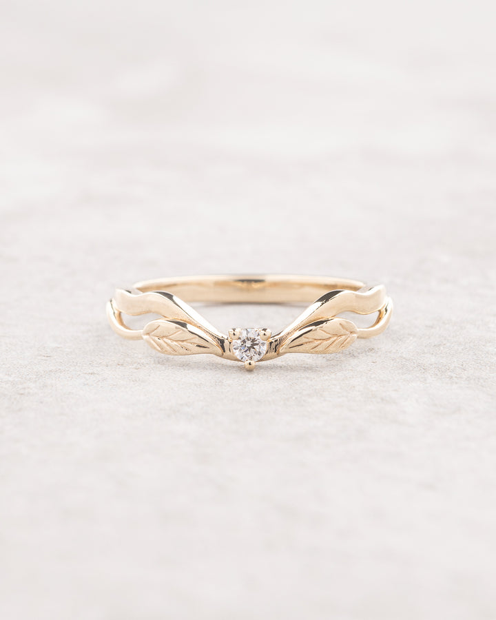 This diamond wedding band was designed especially to match with our Clematis engagement ring. It features minimalistic leaf design with naturally curved band. Shown in white gold with natural diamond it could be made in other gold colours and with different gemstones by request. Check also version with three gemstones.