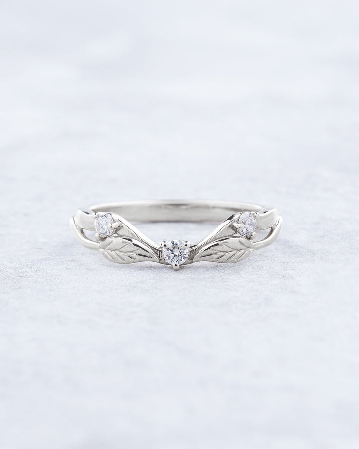 This three diamond wedding band was designed especially to match with our Clematis engagement ring. It features minimalistic leaf design with naturally curved band. Shown in white gold with natural diamond it could be made in other gold colours and with different gemstones by request.