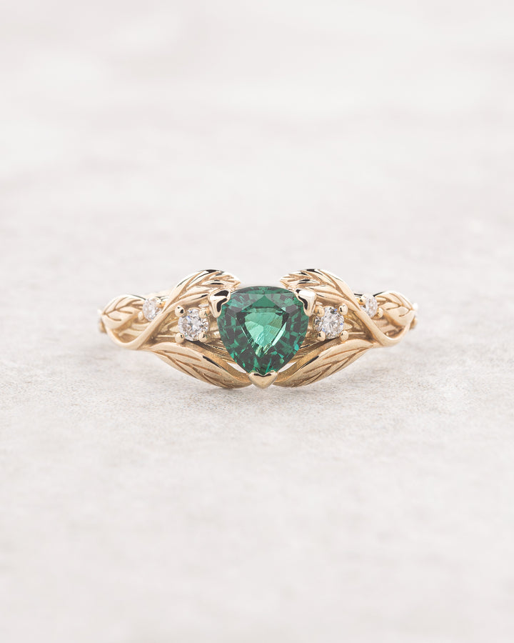 Emerald trillion cut engagement ring, gold leaves and diamonds ring