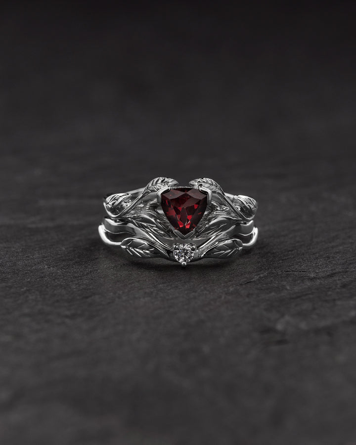 The Clematis engagement ring designed by my original sketches is accompanied here with lovely branch wedding band. These solid gold rings featuring trillion cut red garnet and conflict-free diamond. If you're looking for alternative nature inspired rings, these pair would make a perfect wedding jewelry duo.
