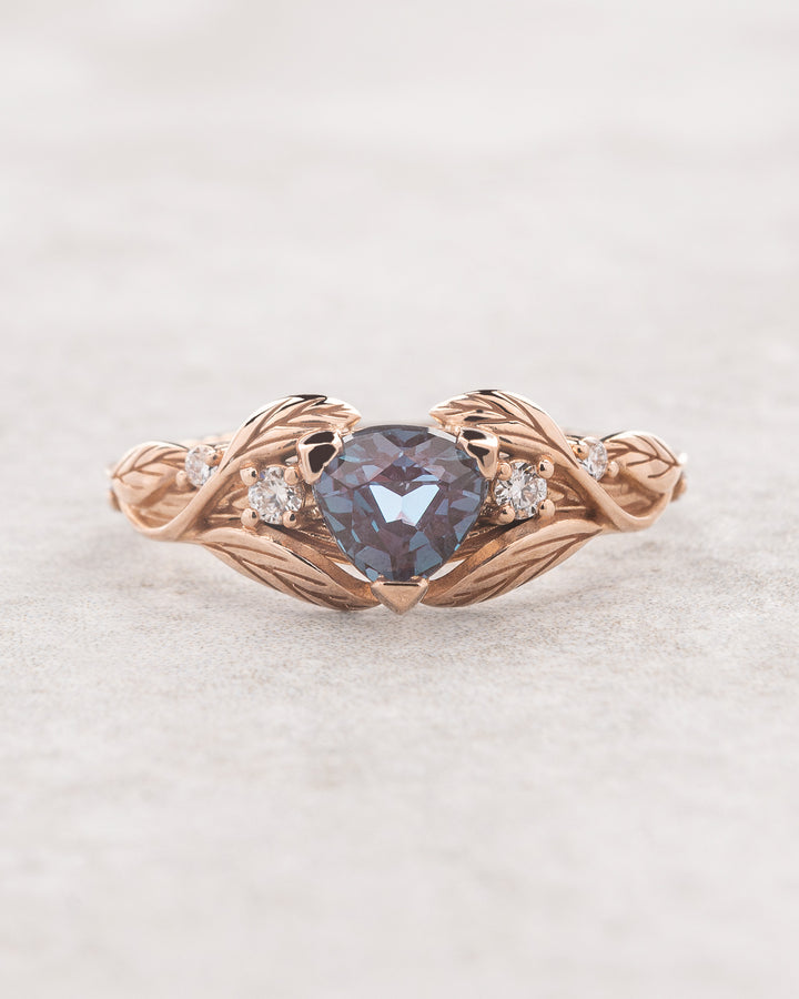 Trillion alexandrite engagement ring, gold leaves and diamonds ring