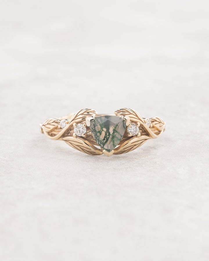 Trillion moss agate engagement ring, gold leaves and diamonds ring
