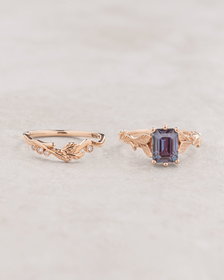 Emerald-cut alexandrite bridal set, nature themed branch proposal ring set / Freesia