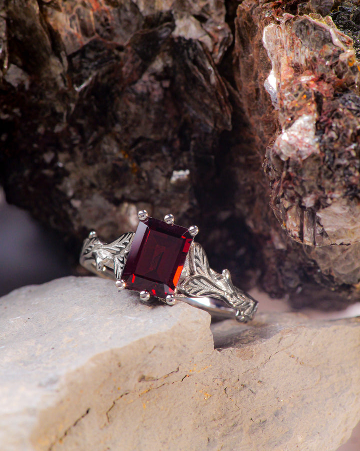 READY TO SHIP: Freesia in 14K white gold, emerald cut garnet, AVAILABLE RING SIZE: 5.5 - 8.5 US
