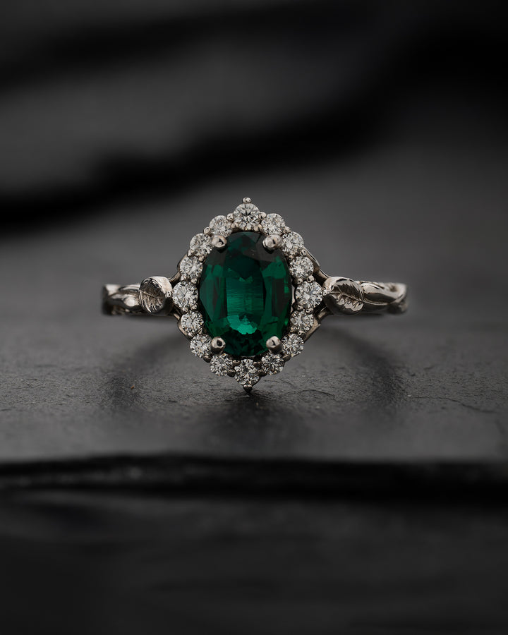 READY TO SHIP: Florentina ring with lab emerald & accent diamonds, 14K white gold, AVAILABLE RING SIZE: 5.5 - 8.5 US