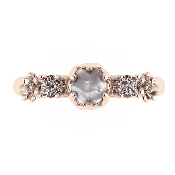 Romantic engagement ring Fiorella features a nature-inspired style with a round cabochon cut central gemstone. The engagement ring has two tiny flowers on each side and is set with diamonds (lab or natural of your choice). The central gemstone has an open, ornate setting that shows the gemstone in the best way .
