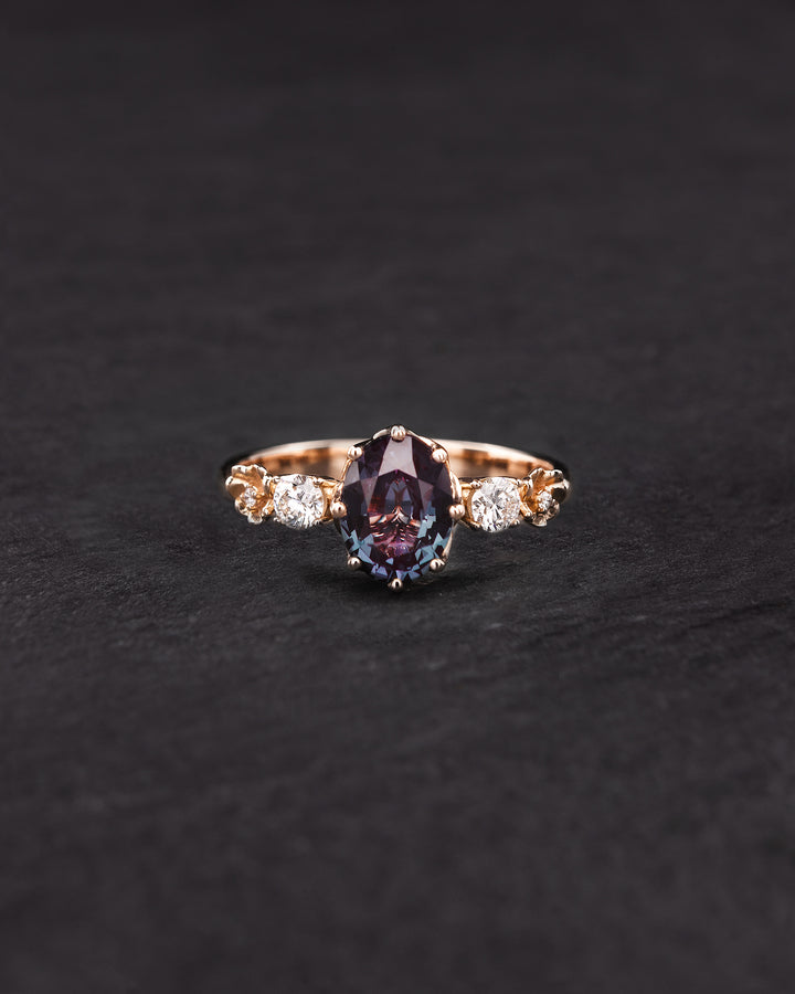 Lab alexandrite engagement ring with tiny flowers and diamonds