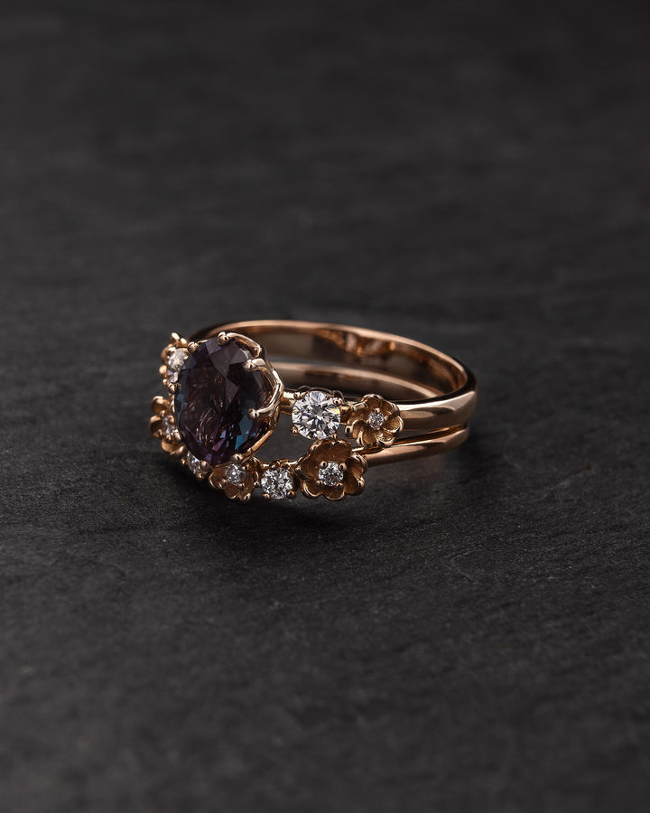Romantic bridal ring set with colour changing alexandrite and diamonds / Fiorella