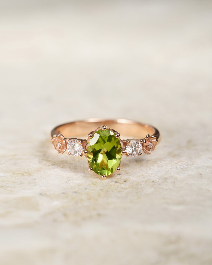 Romantic engagement ring features nature inspired style with an oval cut natural peridot. The engagement ring has two tiny flowers on each side and is complimented with diamonds (lab or natural by your choice). Central gemstone has opened ornate setting which shows the gemstone in the best way.