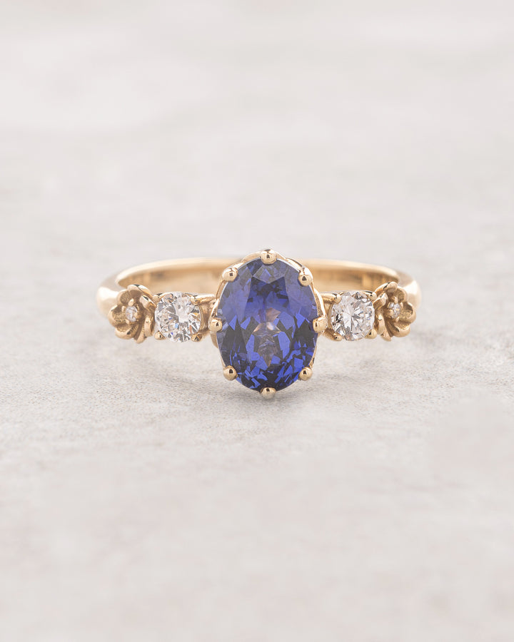 Romantic engagement ring features nature inspired style with an oval cut lab sapphire. Engagement ring has two tiny flowers on each side and complimented with diamonds (lab or natural by your choice). Central gemstone has opened ornate setting which shows the gemstone in the best way.