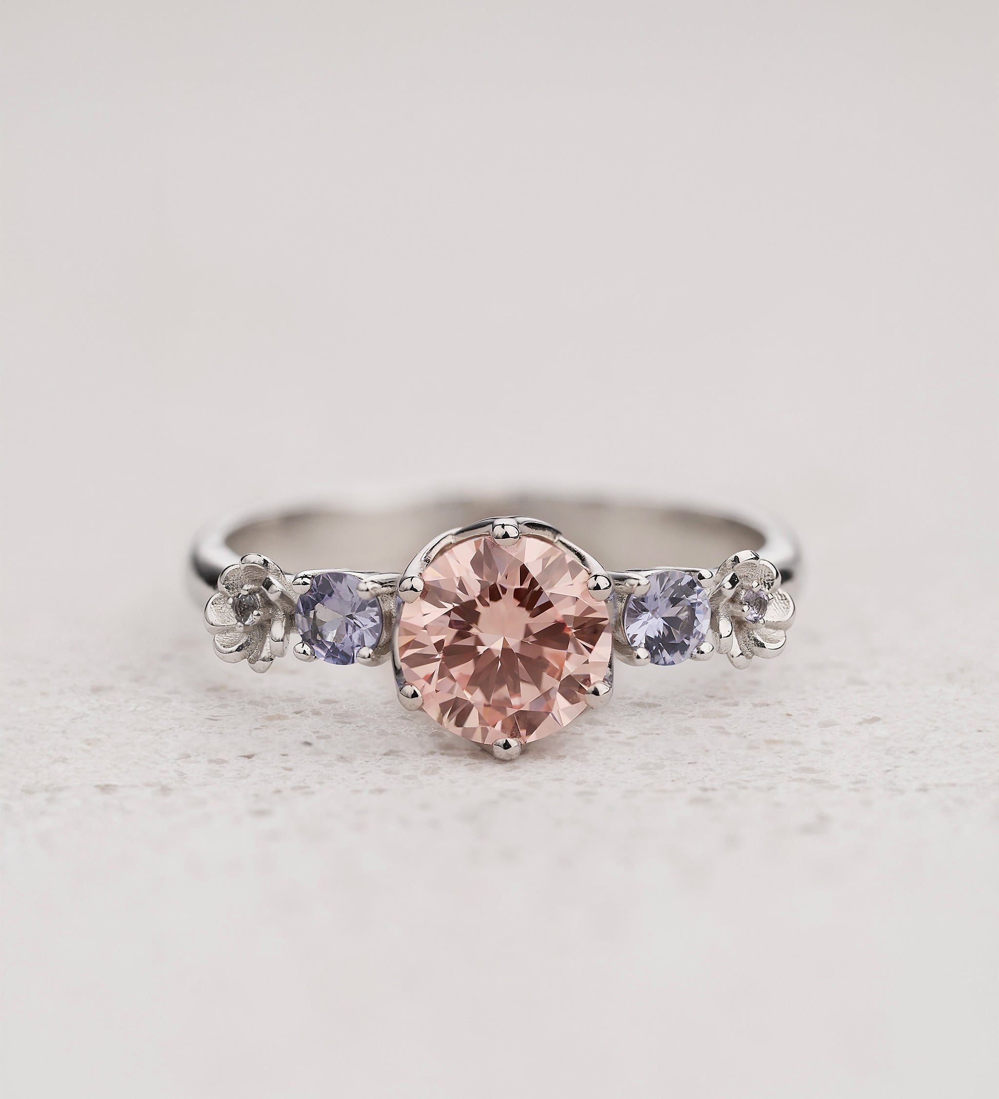 Pretty much anything. Our flower setting engagement rings work with natural diamonds, lab-grown diamonds, and colored gems like sapphire, emerald, morganite, aquamarine, alexandrite, tanzanite, and ruby. Moss agate is a customer favorite: the natural green inclusions look like tiny gardens inside the stone, which pairs beautifully with floral settings. Floral designs actually look amazing with colored stones because the organic shapes bring out each gem's personality. Floral designs actually look amazing with colored stones because the organic shapes bring out the gem's personality.