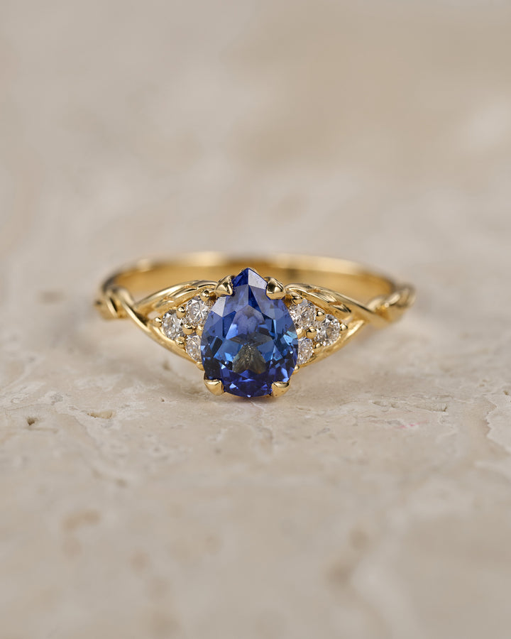 Gloria engagement ring features an elegant and modern pear-cut gemstone with a combination of a dainty leaf band. Side diamonds create a triangle on each side of the central gemstone and add an extra sparkle. A great choice for those looking for an engagement ring with a minimalistic look, yet a nature-inspired style. It looks complementary on any hand, thanks to the vertical position of the central gemstone.