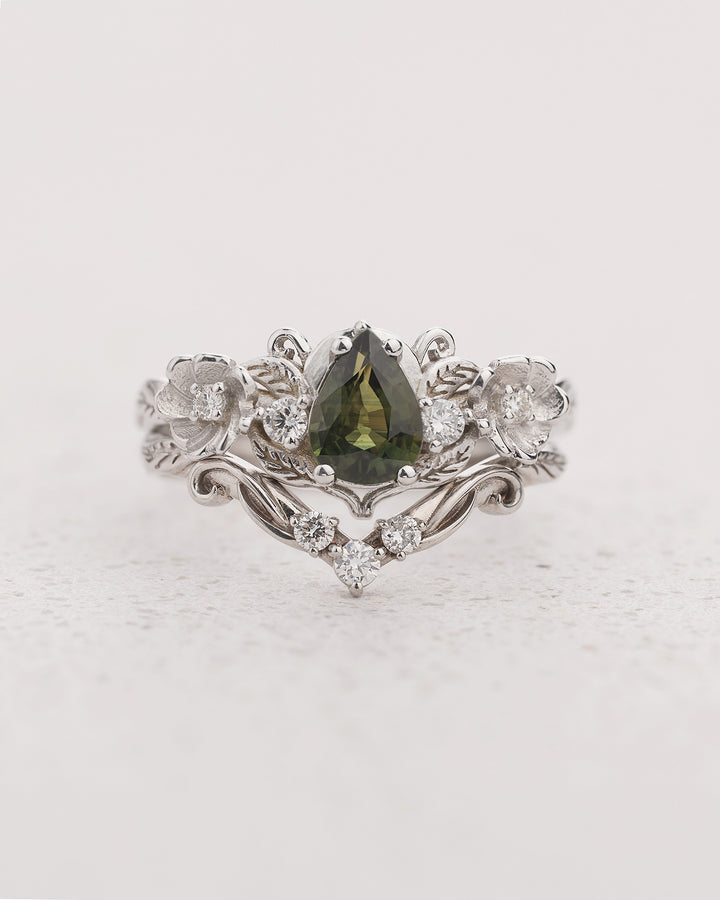 Adelina ring shows sophisticated style with a central pear-cut gemstone, two flowers adorned with lab-grown or natural diamonds and delicate leaves. This unique engagement ring features author's design inspired by nature.