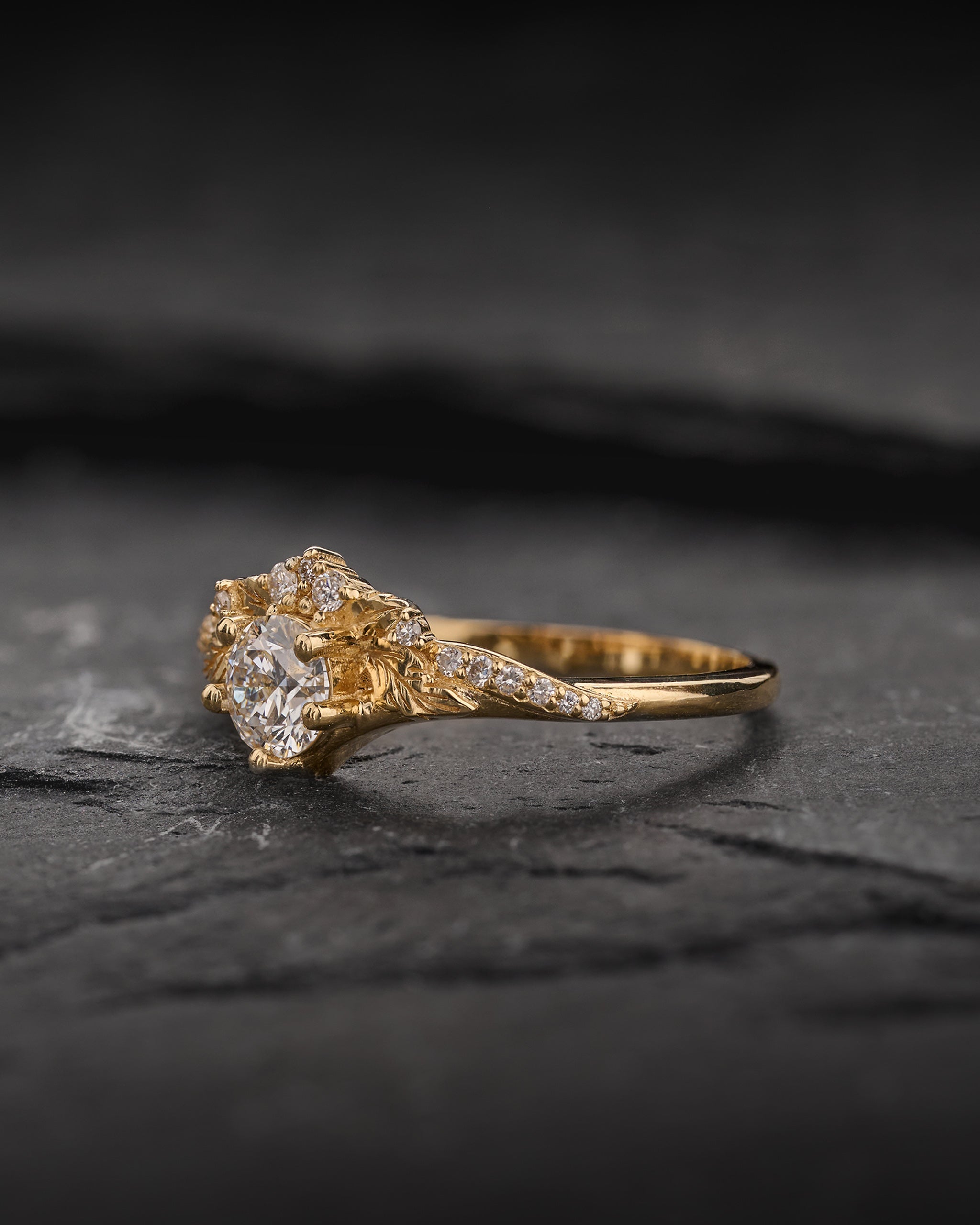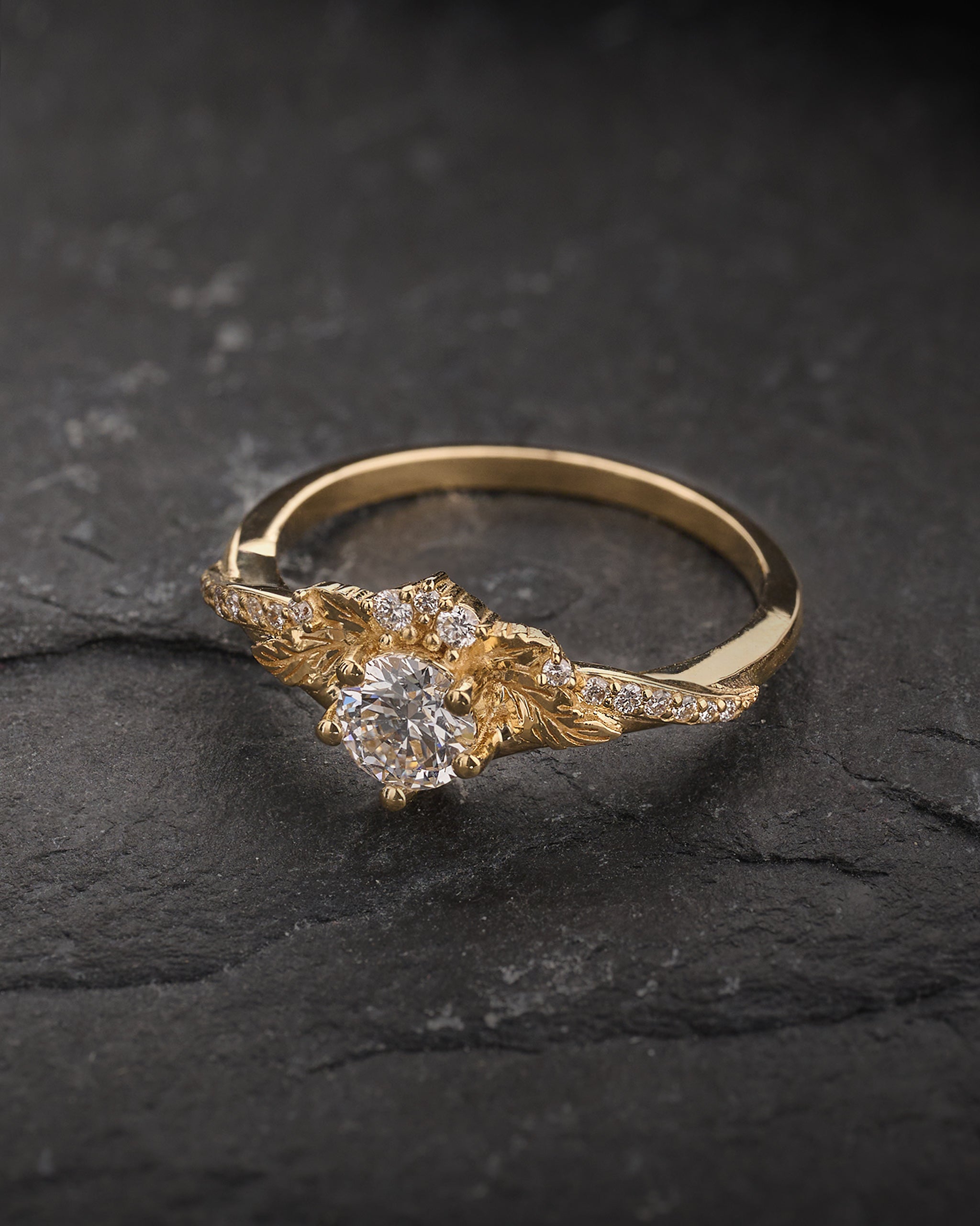 Magnificent wedding ring features nature inspired design with highly detailed tiny leaves. Lab grown diamond is complemented with natural sparkling lab grown diamonds or natural diamonds.