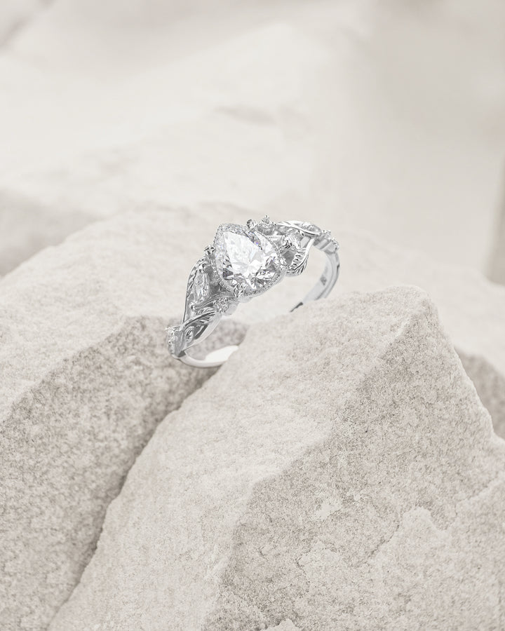 Pear lab grown diamond engagement ring, white gold nature inspired ring with leaves and diamonds
