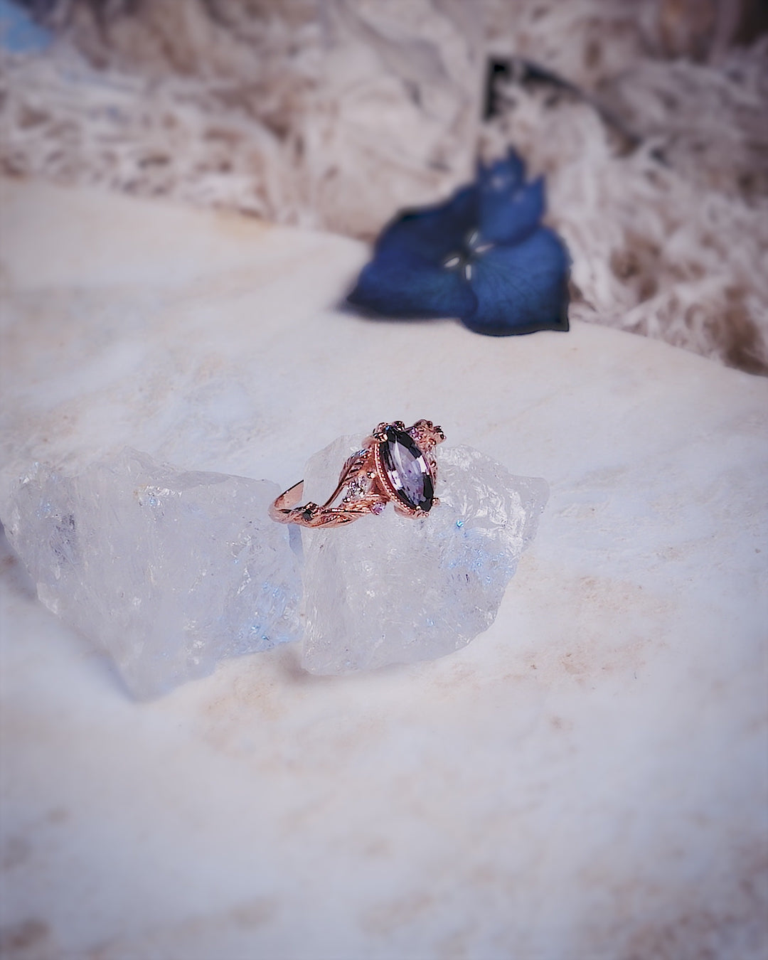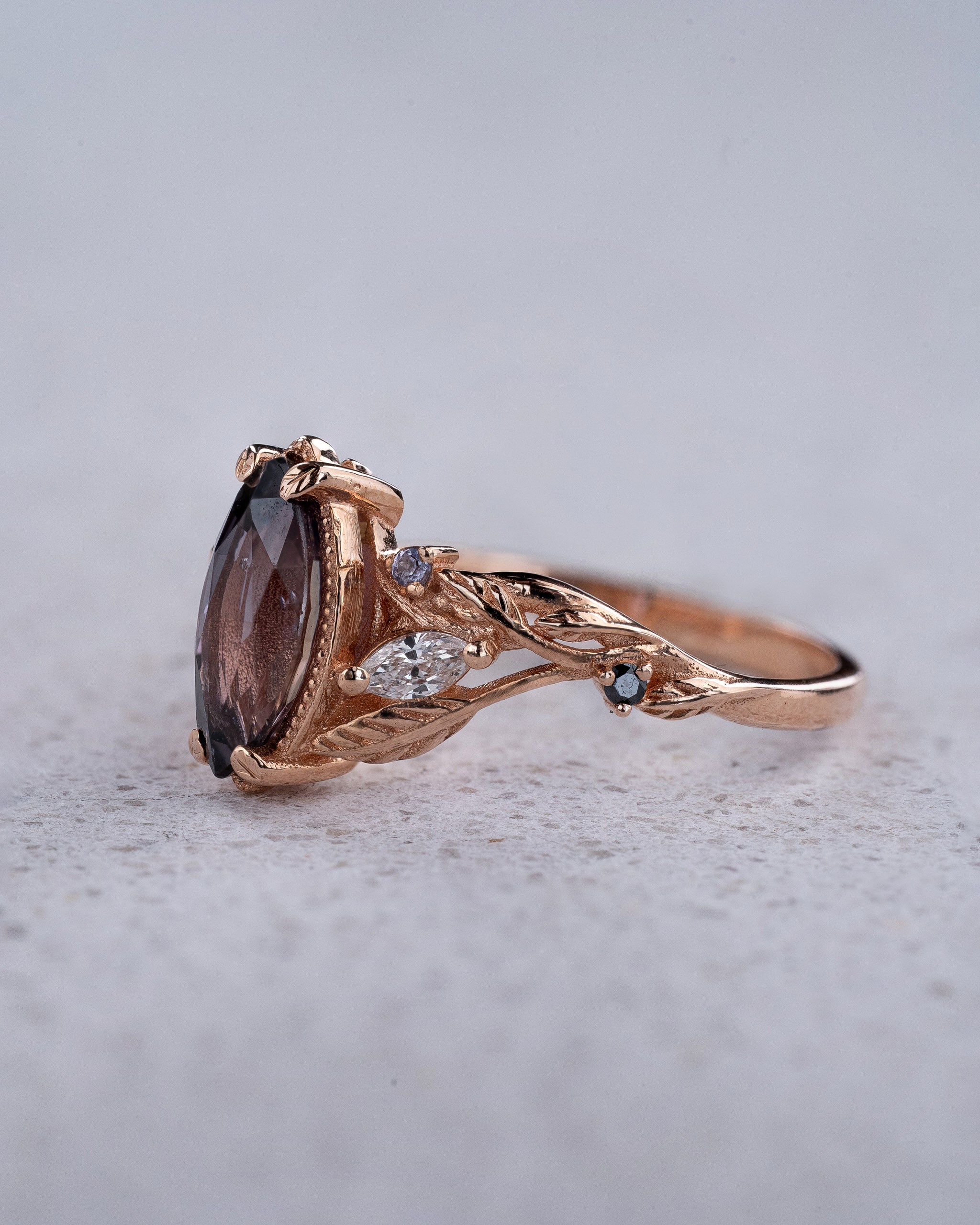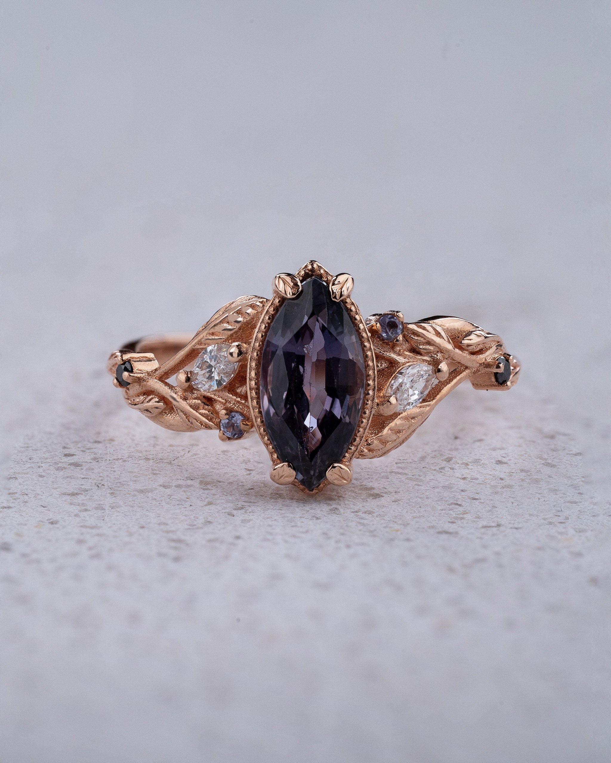 Patricia ring shows intricate design with vines and leaves interlacing in a natural way. Side gemstones are scattered between twigs - marquise-cut lab-grown diamonds remind leaf shapes, and round-cut tanzanites and black sapphires highlight the central gemstone, which has a beaded frame around it, adding extra detail.