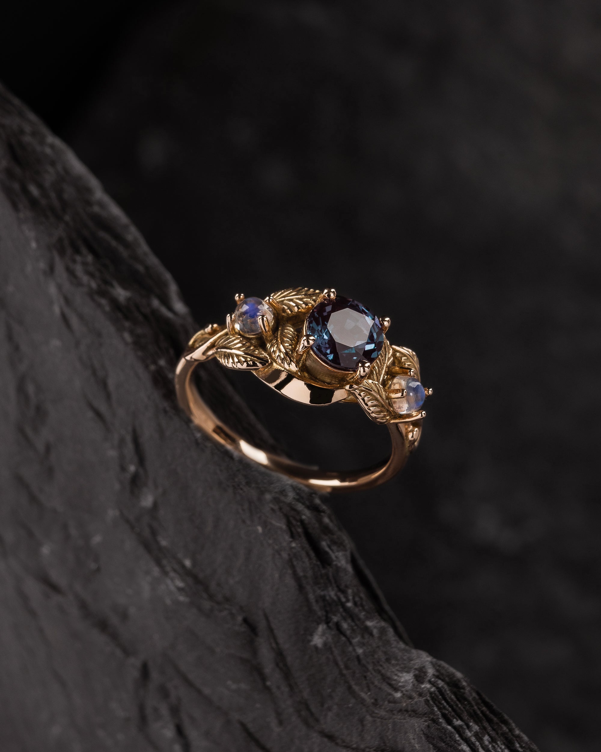 This is an upgraded variation of our Azalea style ring - it features central alexandrite gemstone with natural moonstones as accents. Nature inspired engagement ring is made of solid gold looks really delicate and charming. Thanks to a balanced design and thickness of material used, it is sturdy and durable for everyday wear.