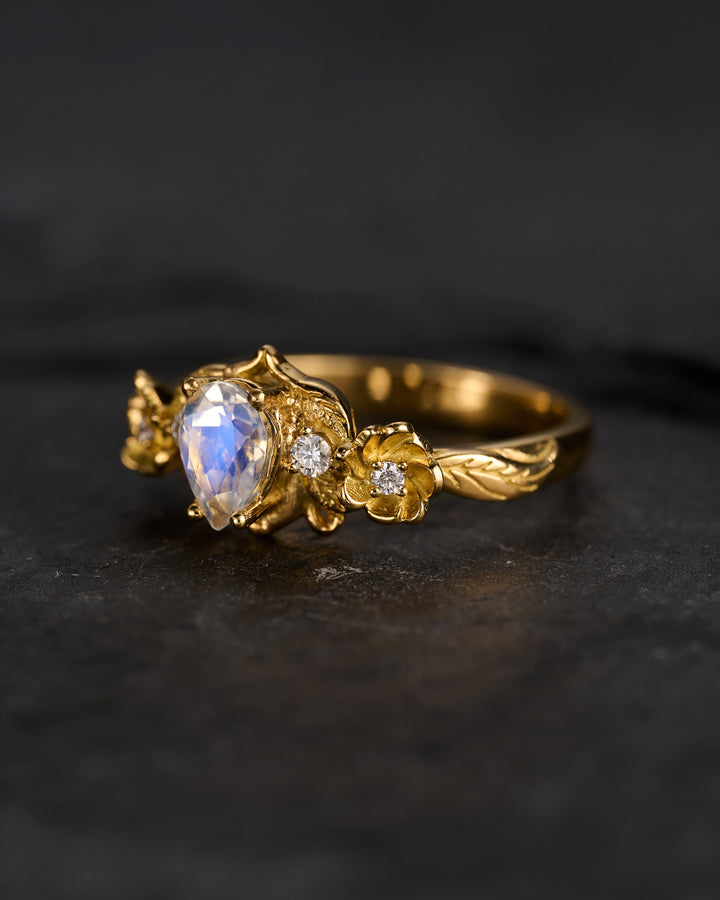 READY TO SHIP: Adelina in 18K yellow gold, natural pear cut moonstone 7x5 mm, moissanites, RING SIZE 6.5 - 9.5 US - Eden Garden Jewelry™