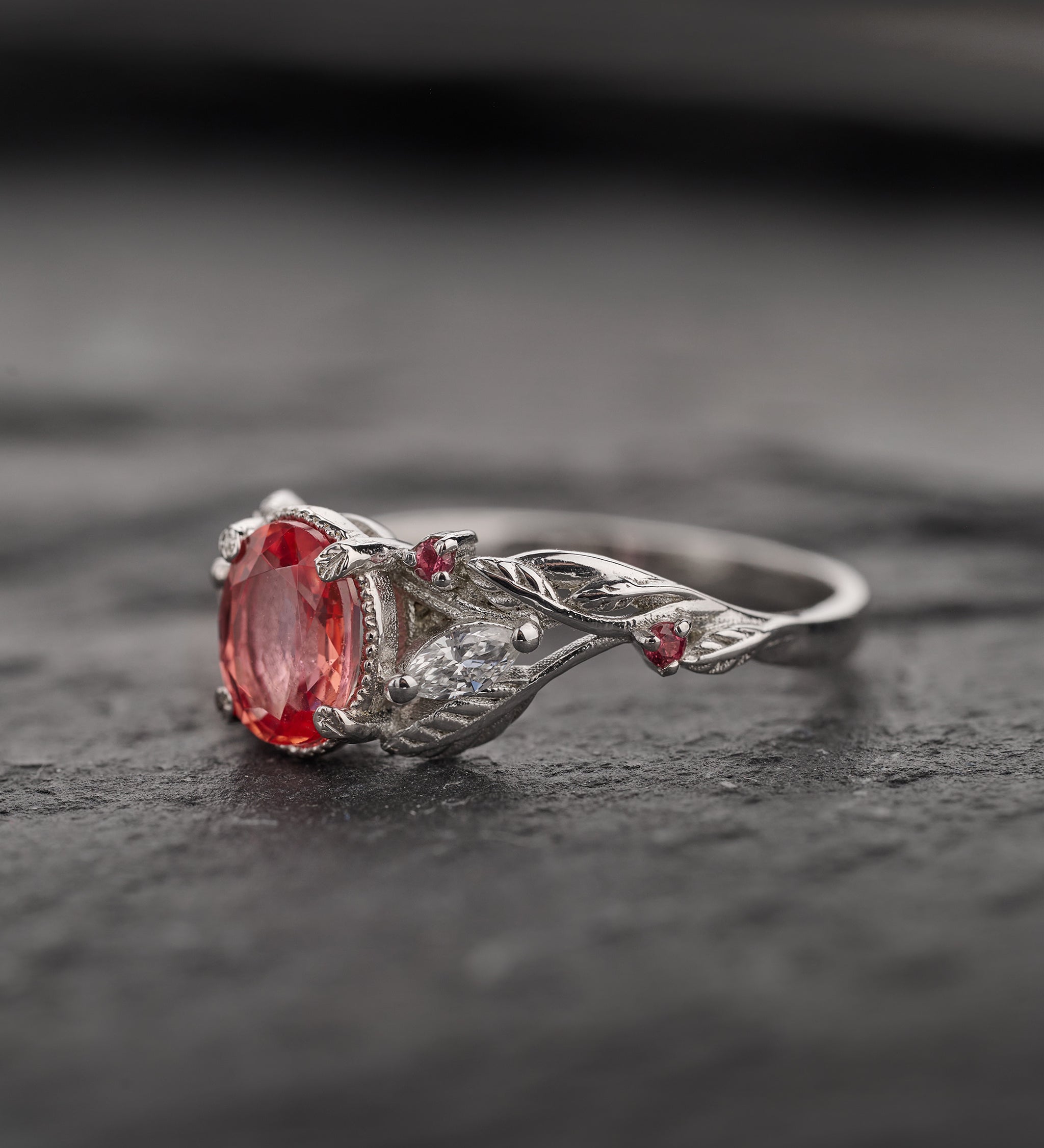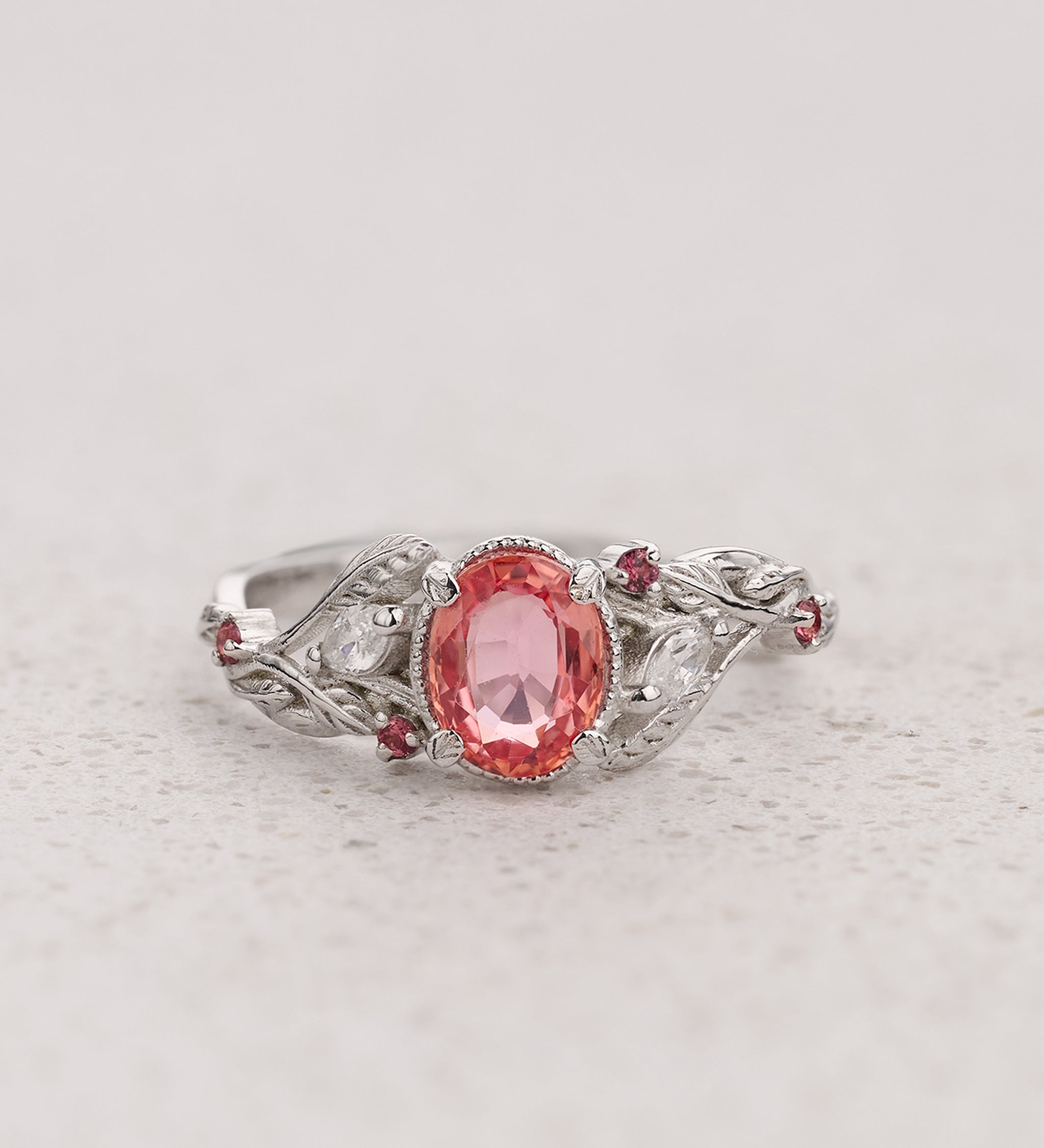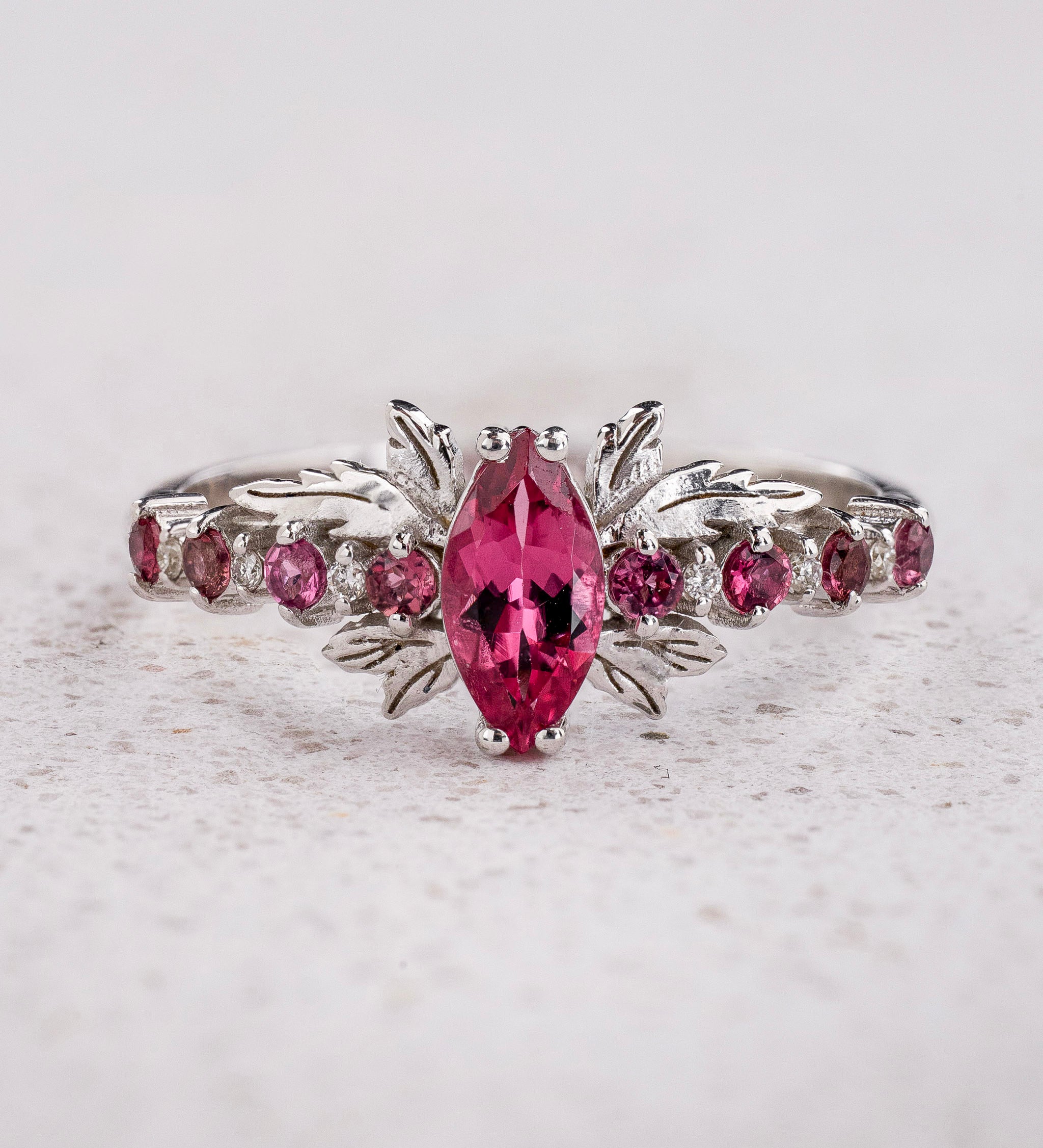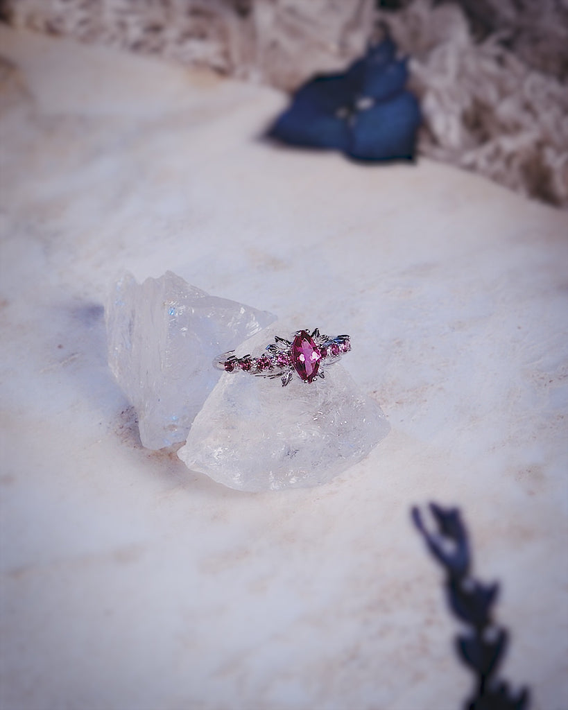 A rare species of flower grows in our garden, from the center of which we extract a mesmerizing pink stone. The exotic hue of the stone will spectacularly emphasize your uniqueness, unparalleled by anything.