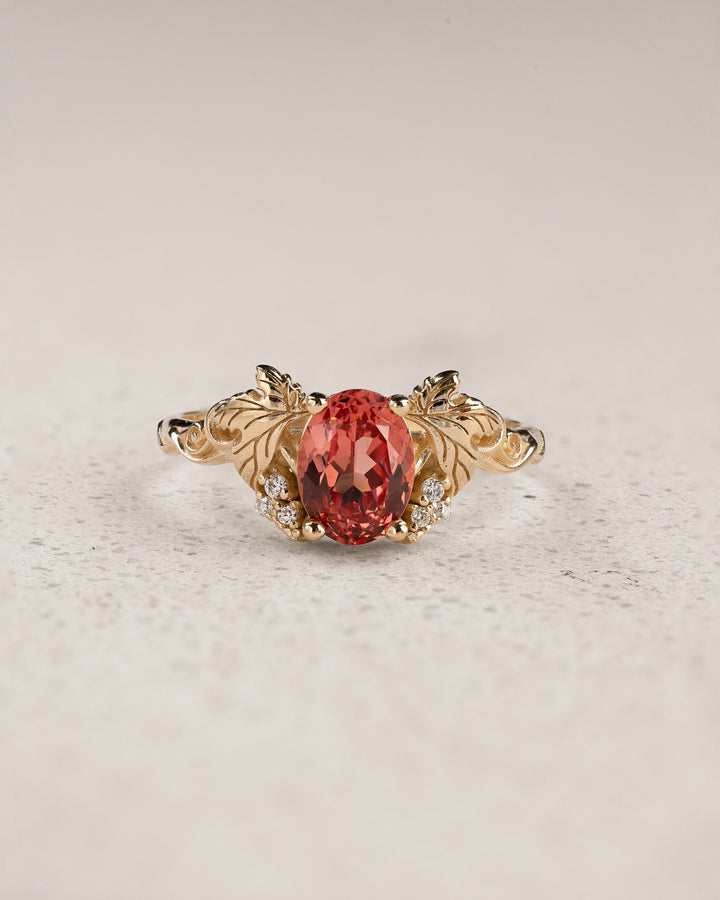 Oval Padparadscha Sapphire Engagement Ring with Golden Grape Leaves / Vineyard