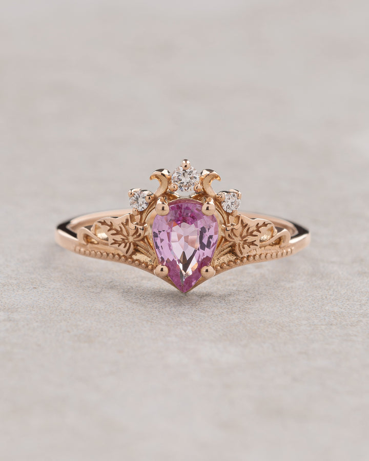 Magnificent proposal ring features nature inspired style with tiny ivy leaves and the most delicate details you can imagine. This version comes with pear cut gemstone - natural pink sapphire.