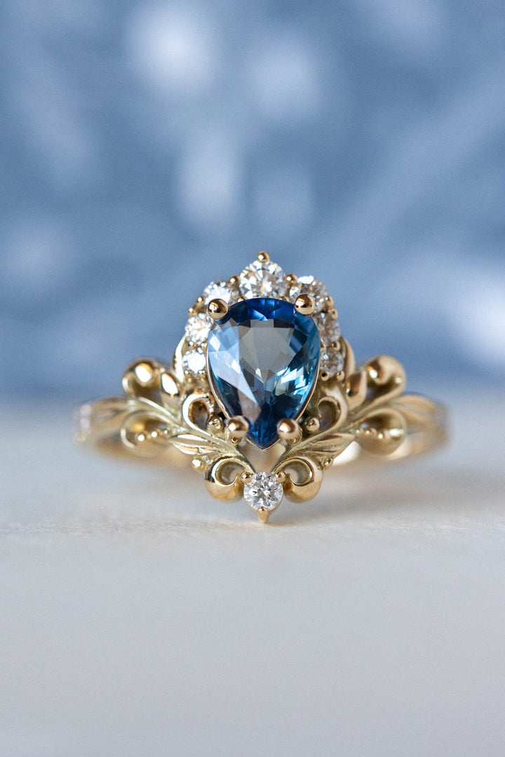 Natural blue sapphire engagement ring, baroque inspired gold ring with diamonds / Sophie
