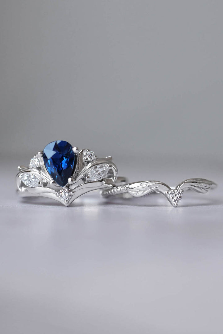 Blue sapphire leaf engagement rings, bridal ring set / Swanlake