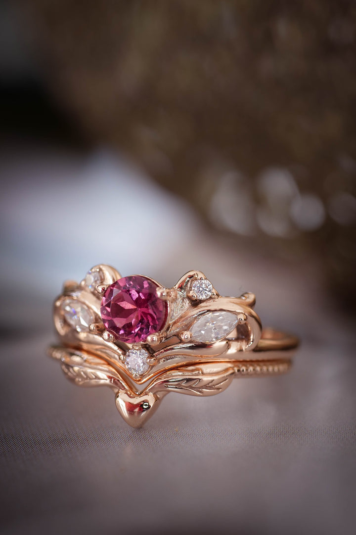 Magnificent Swanlake wedding ring set features nature inspired style complimented with tiny winged heart below. This style shows natural pink tourmaline with very rich and 'juicy' colour.