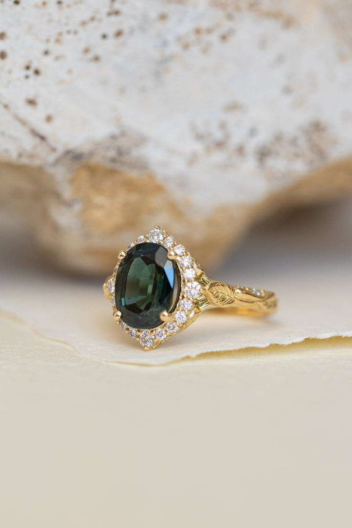 Diamond halo and natural teal sapphire engagement ring, nature inspired yellow gold ring