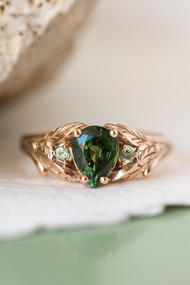 This Wisteria engagement ring features nature inspired design with leaves wrapping around beautiful natural green sapphire. Adorned with round accent teal sapphires, placed between skilfully made leaves.
