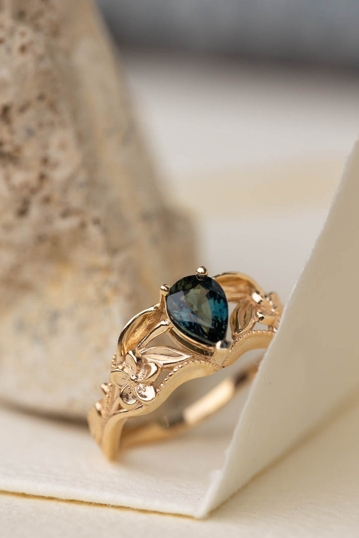 Eloise engagement ring is made from solid gold and adorned with natural pear cut teal sapphire. Romantic design shows flowing lines, flowers and leaves. Inspired by art nouveau style this unique ring will impress by it's delicate details and sophisticated design. Perfect gift for those women who admire floral jewelry and prefer timeless style.
