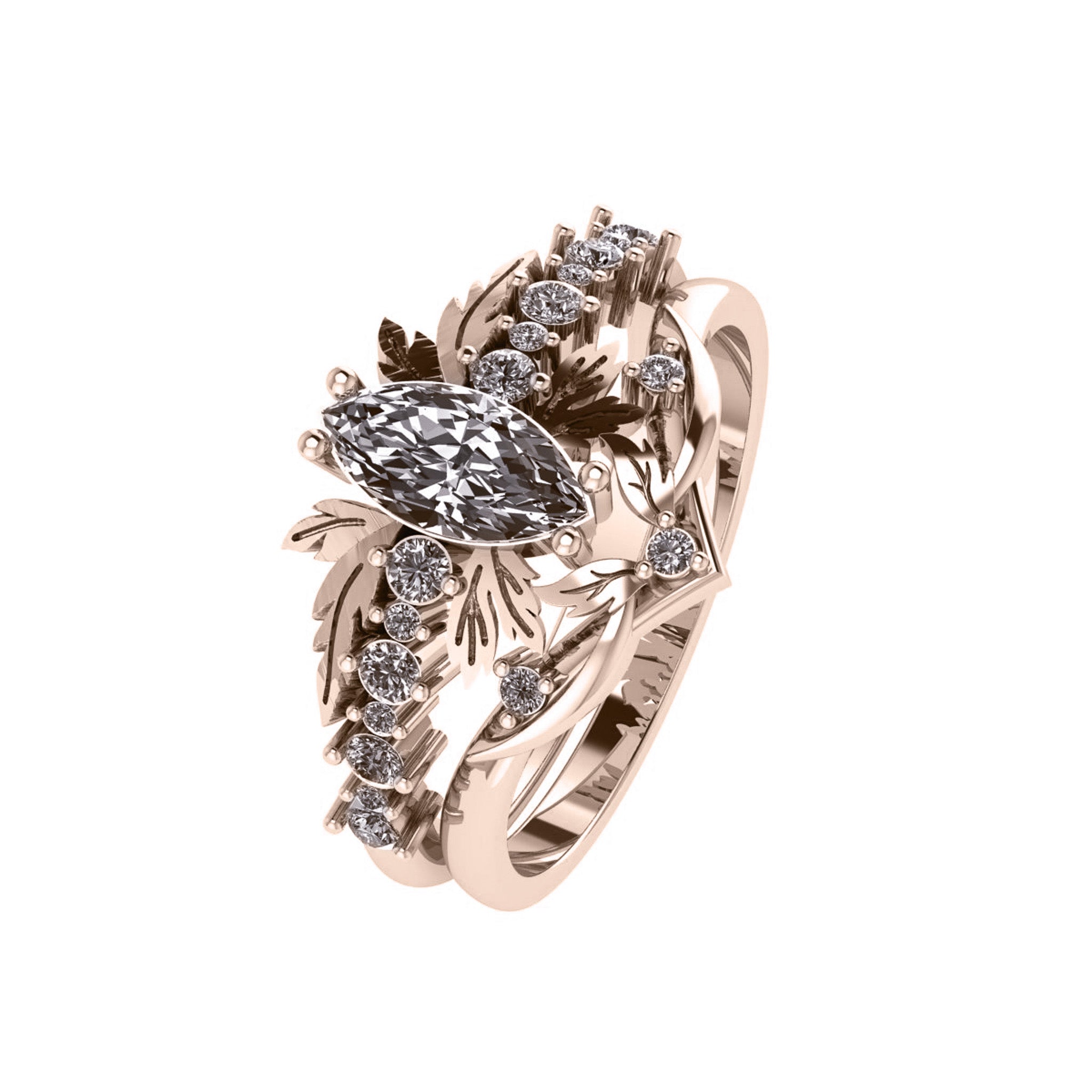 Timeless elegance with a botanical twist. Verbena’s focal gemstone rests on a wreath of intricate gold leaves that give it a sculptural quality, but the ring is smooth enough for everyday wear. The accent diamonds on the band alternate in size like water droplets, adding sparkle and brilliance. Our Verbena setting is shown with a marquise cut stone, but it can be adapted for other cuts. Choose natural or lab grown diamonds for the band.
