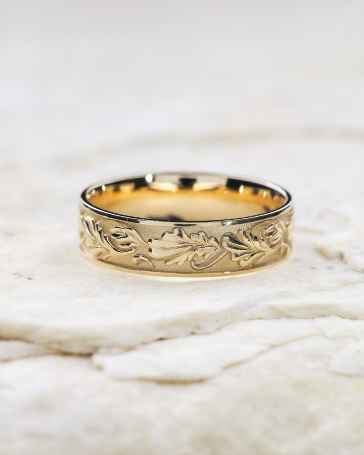 Carved oak leaves wedding band