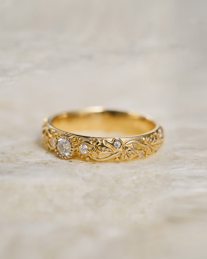 Ivy leaf wedding ring with diamonds, comfort fit ring