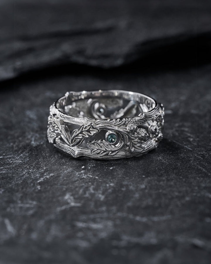 Oak leaves wedding band with teal sapphires and acorns - Eden Garden Jewelry™
